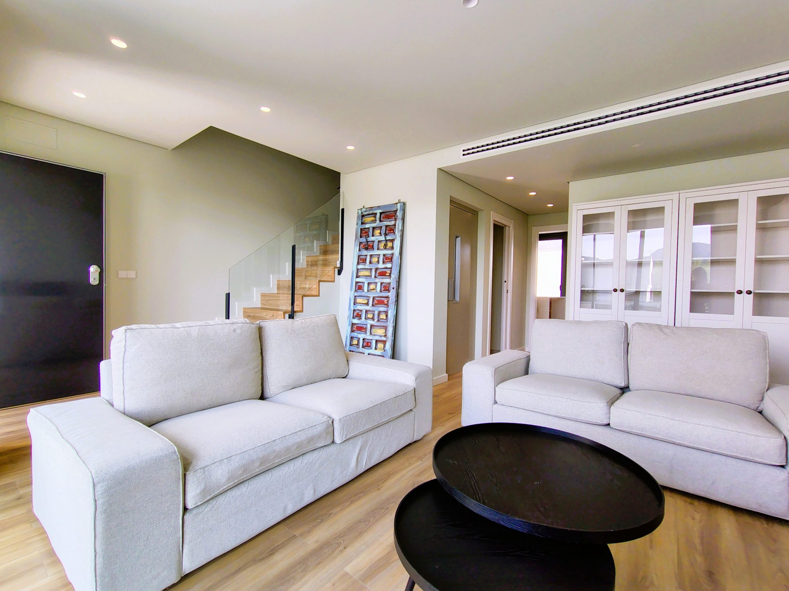 The only communal area is the underground car park, where there are 2 private large parking spaces next to each other. Directly adjacent to these parking spaces there is a connecting door to a large room (can be used as a storage room, office, etc.) from which you have access to the 2 residential floors via stairs or a private elevator. The main entrance to the house leads past a small garden area with its own small pool. On the main floor there is a living room, a large, bright kitchen (with new electrical appliances) and direct access to the large courtyard as well as a guest toilet. On the upper floor there is a total of 1 master bedroom with fitted wardrobes and an en-suite bathroom as well as two further bedrooms, also with fitted wardrobes and another bathroom.
