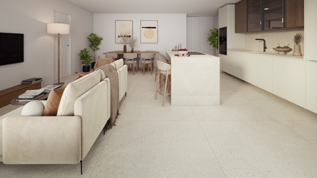 The residence features three elegant bedrooms and two beautifully appointed bathrooms, designed with premium materials and a sophisticated aesthetic. The bright, open-plan living and dining areas are framed by large floor-to-ceiling windows, seamlessly blending indoor and outdoor living while maximizing natural light and mountain views.