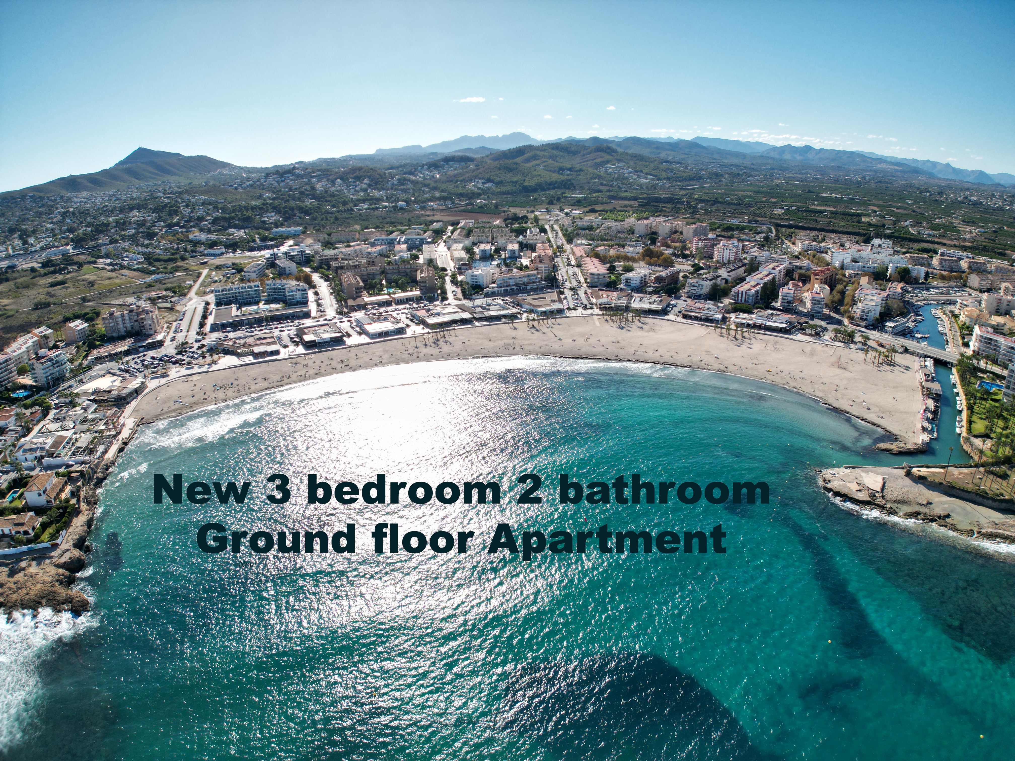 On one level, Brand new luxury ground floor apartment for sale in Arenal area of Javea, corner plot with large wrap around terrace, key ready NOW, built to very high specification, comprising of 3 bedrooms, 2 bathrooms, lounge/dining room leading to 110m2 of outside terrace, south facing, luxury fully equipped kitchen with with an oven, hob, microwave, dishwasher, washing machine and refrigerator, all integrated including a separate utility room, includes hot and cold air conditioning,