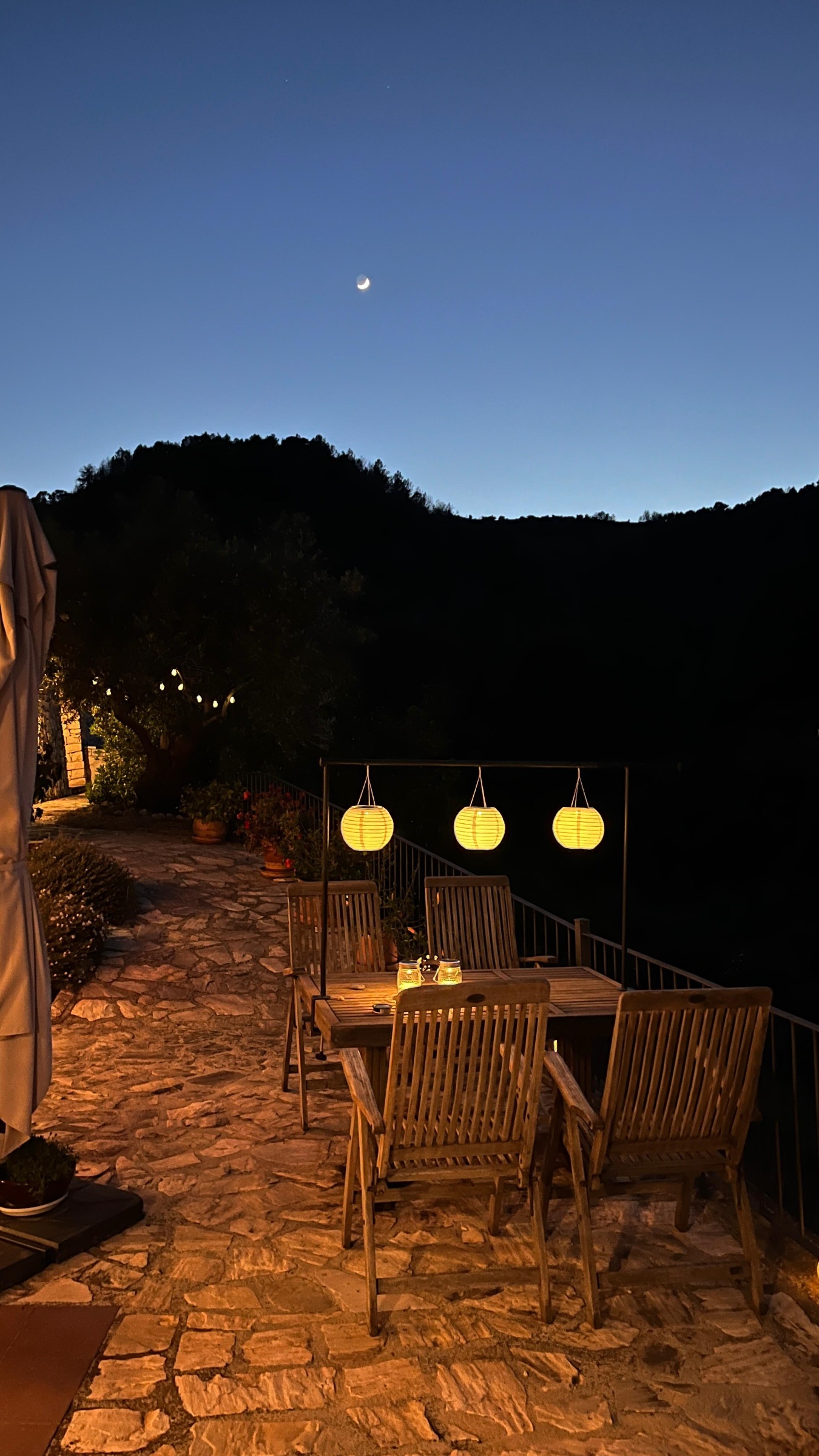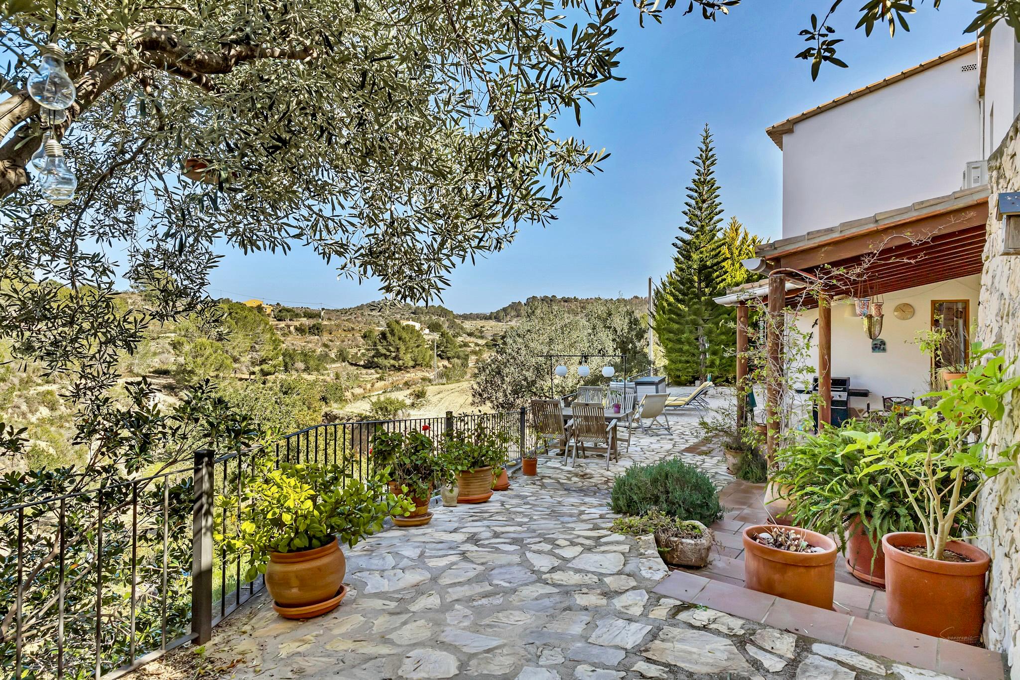 This level also includes a large communal garden, a pétanque court and a generous 12 × 6 metre saltwater swimming pool, surrounded by nature with ample space to enjoy the sun and views. Panoramic mountain views include Bernia, Solana and Olta. The gardens and surrounding grounds are tastefully landscaped, evergreen and low-maintenance, with additional olive trees. With over 17,000 m² of land, the property offers abundant privacy, sunshine and also plenty of shaded areas.