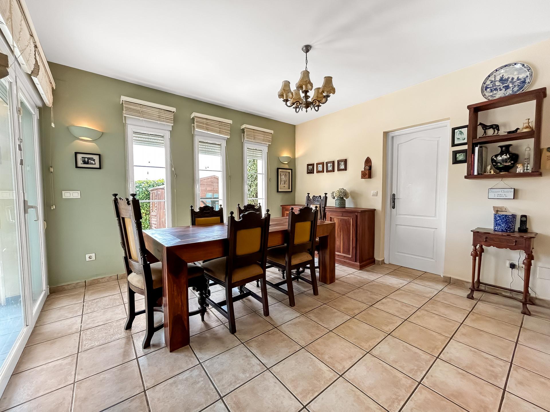 Built in 2002 and maintained in excellent condition, the 260 m² villa offers spacious interiors filled with natural light. Enter through electric gates and a long driveway into an elegant entrance porch. Inside, a wide hallway leads to a modern open-plan kitchen, breakfast room, and dining area, with direct access to a covered naya overlooking the pool. A separate utility room and storage room offer added convenience perfect as a home office or hobby space.