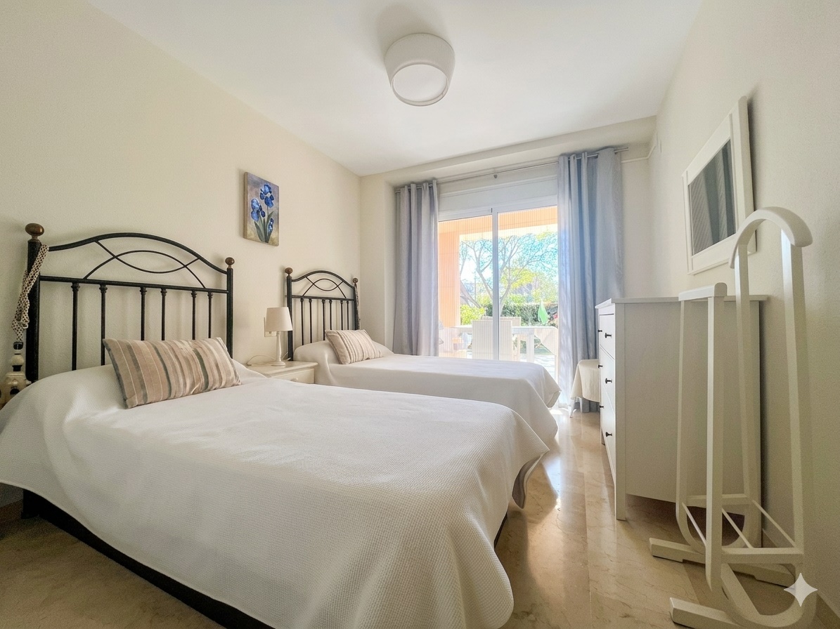 The layout is both practical and appealing, offering two bedrooms with en-suite bathrooms, along with two additional bedrooms and a guest bathroom. Two of the bathrooms have direct access to a terrace or garden area. The master suite is a standout feature, complete with a walk-in wardrobe and a private bathroom with underfloor heating. All beds are fitted with lift-up storage, maximizing space and functionality.