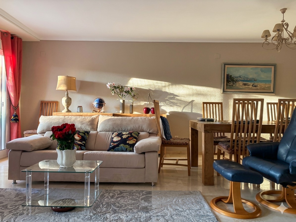 The apartment forms part of a peaceful residential community with no tourist rentals permitted, ensuring a secure and tranquil environment. Residents benefit from a lift and a well-maintained communal pool. The property also includes a private garage parking space and a storage room.