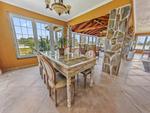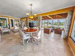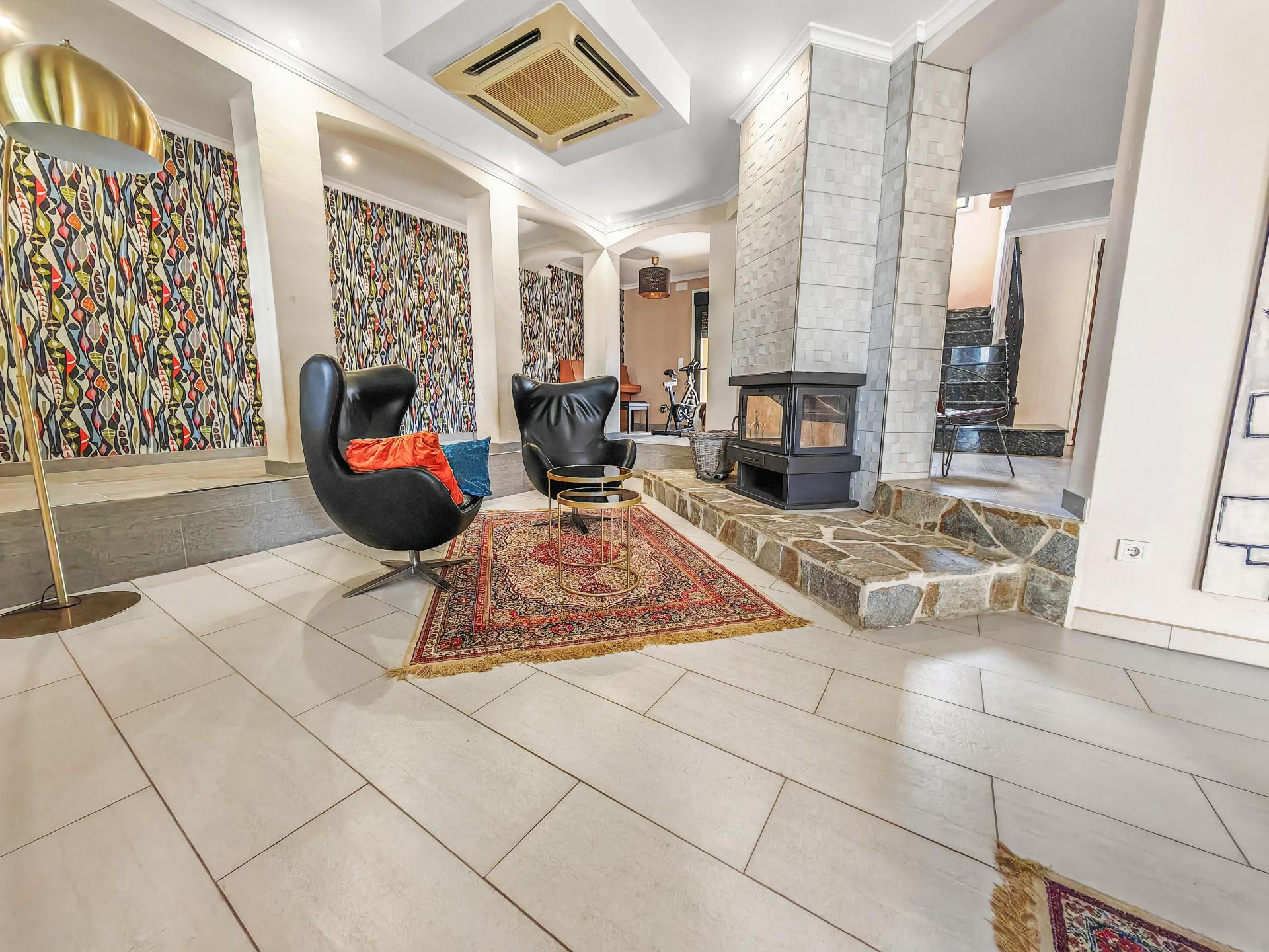 Inside, the home is equally well-suited for flexible living. The ground floor features a welcoming entrance hall, a cozy living room with fireplace, a spacious kitchen with island and bar, and a bright dining area with skylight. A former naya has been enclosed, creating a light-filled additional living and dining space with large windows overlooking the land.
