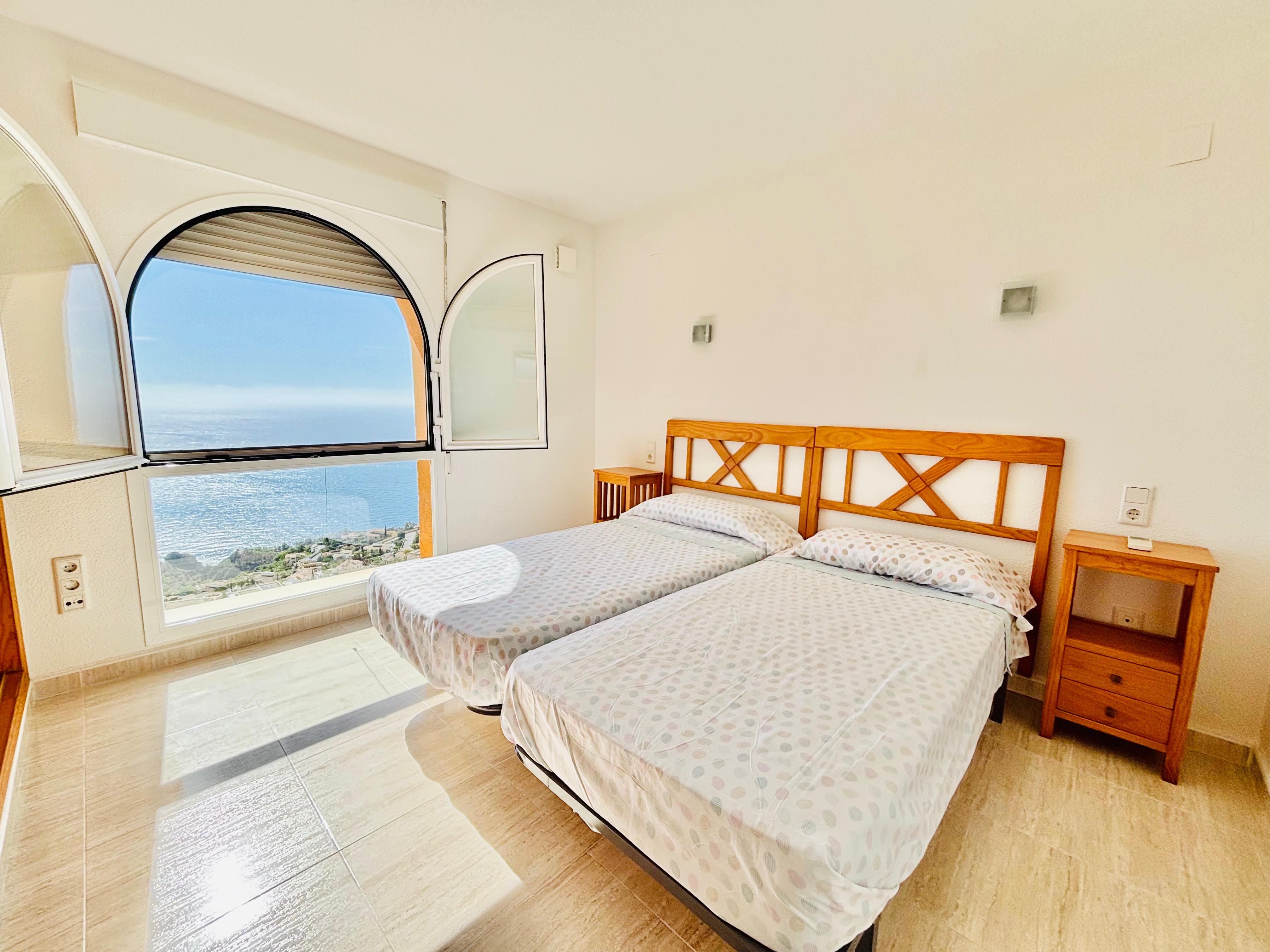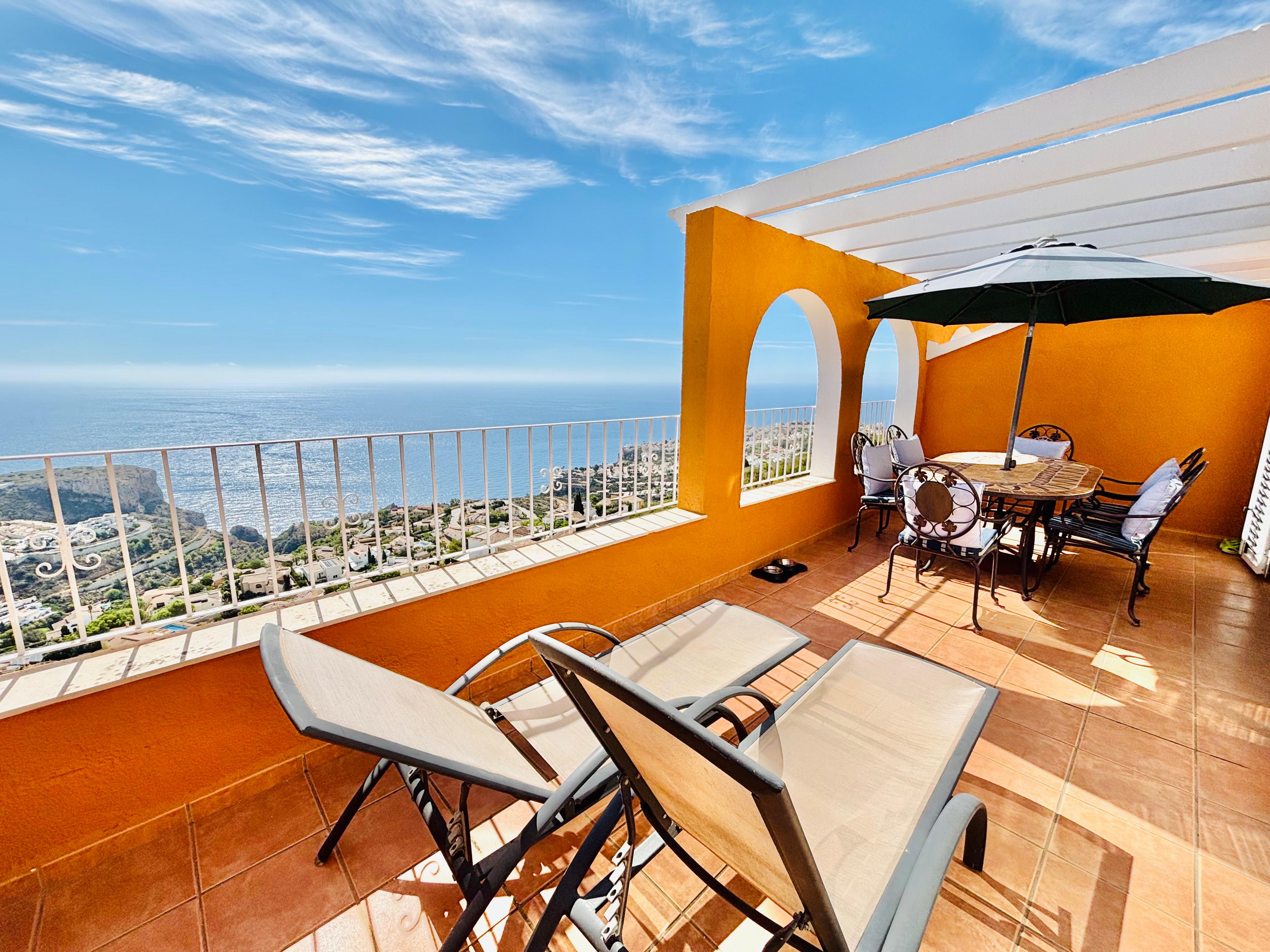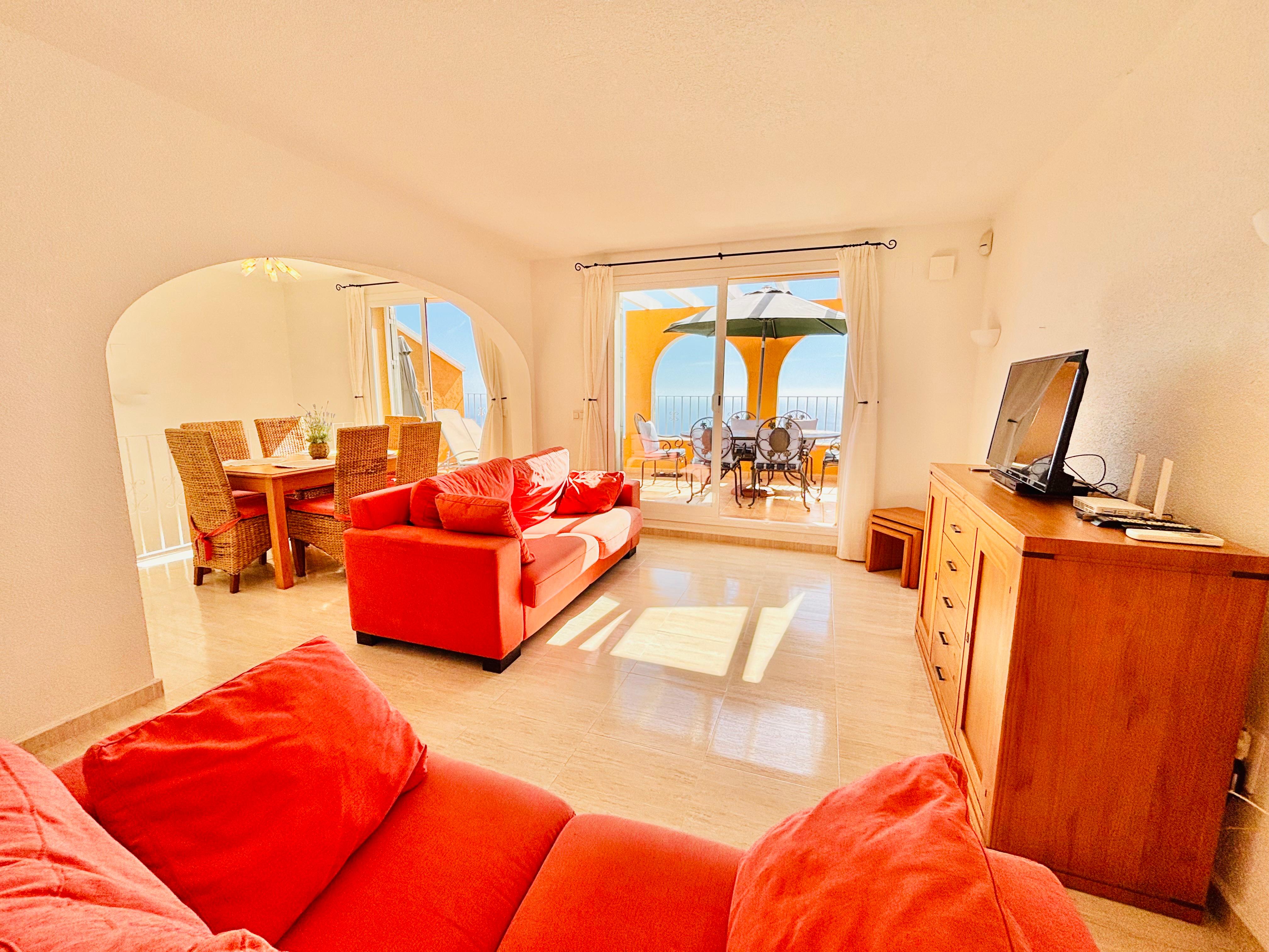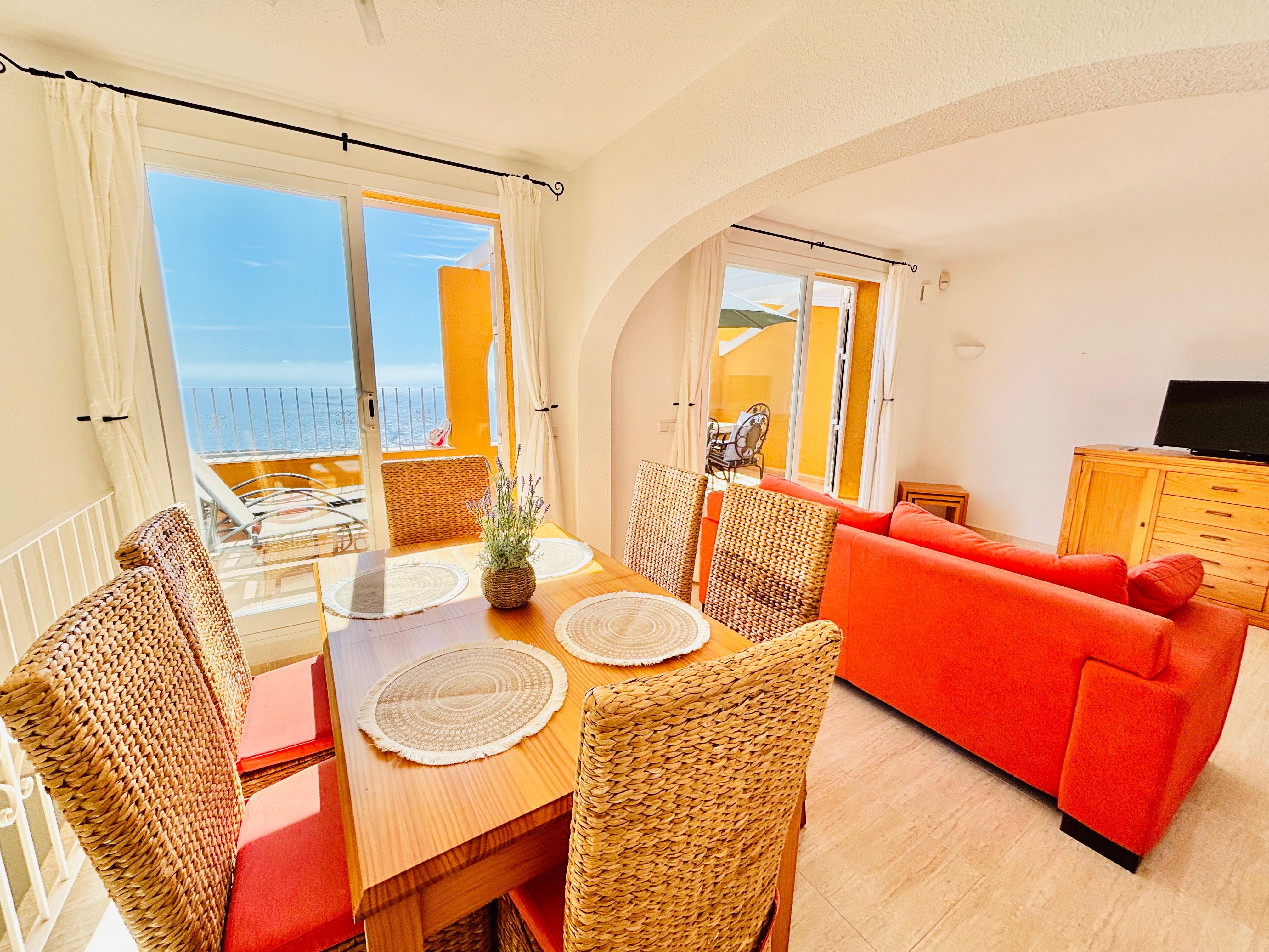 Available from September until the end of May 2027. (FULL RENTAL PERIOD ONLY). Top floor apartment with stunning sea views. Immaculate throughout, lounge and dining area with direct access to an open terrace from where the views will take your breath away, fully equipped kitchen with breakfast bar area onto the living area, there are 3 bedrooms with built in wardrobes and 2 bathrooms, (1 ensuite with bathtub and the family bathroom with shower), air conditioning hot and cold, wifi, located in Benitachell the Cumbre Del Sol area with private parking. Within a well maintained complex with communal swimming pool.