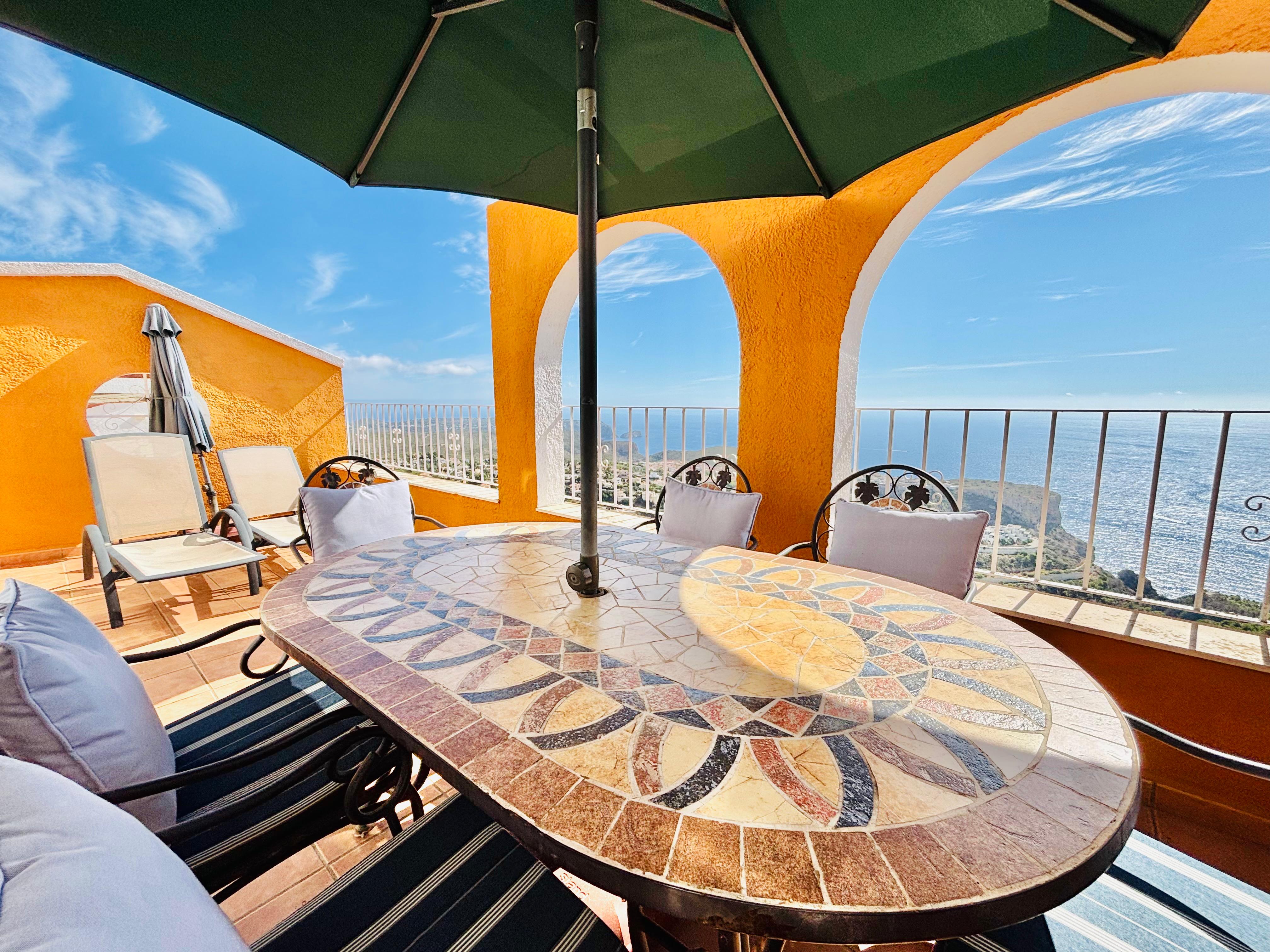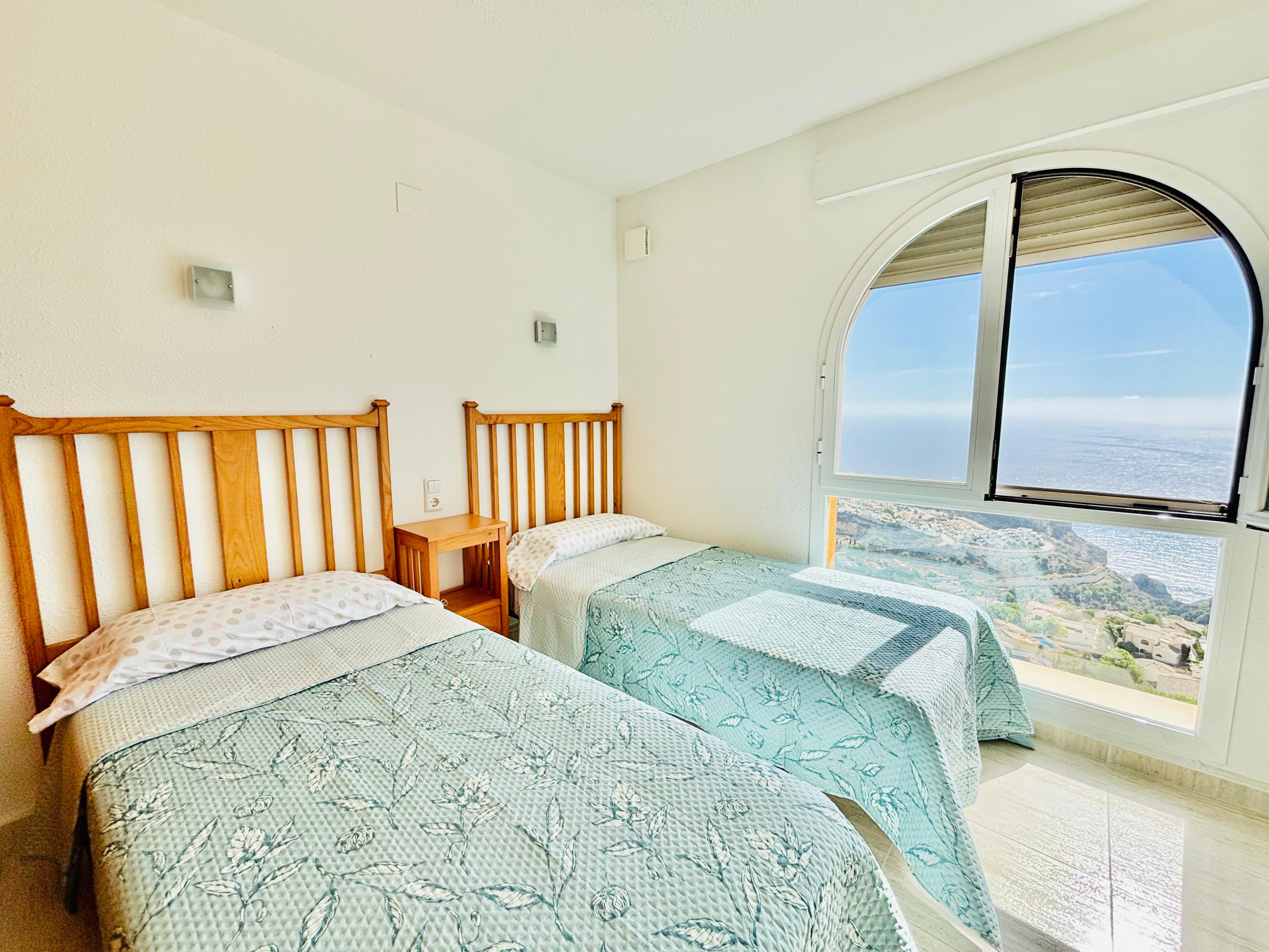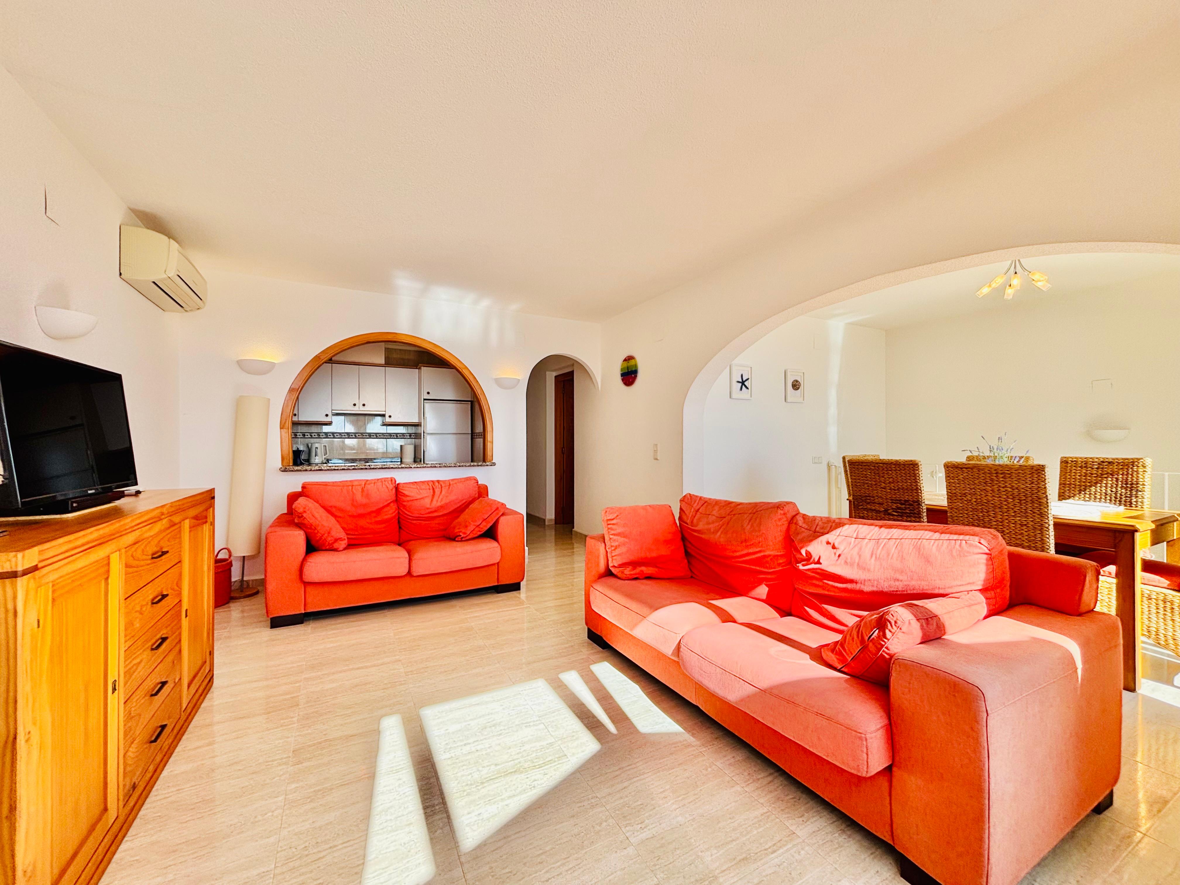 Available from September until the end of May 2027. (FULL RENTAL PERIOD ONLY). Top floor apartment with stunning sea views. Immaculate throughout, lounge and dining area with direct access to an open terrace from where the views will take your breath away, fully equipped kitchen with breakfast bar area onto the living area, there are 3 bedrooms with built in wardrobes and 2 bathrooms, (1 ensuite with bathtub and the family bathroom with shower), air conditioning hot and cold, wifi, located in Benitachell the Cumbre Del Sol area with private parking. Within a well maintained complex with communal swimming pool.