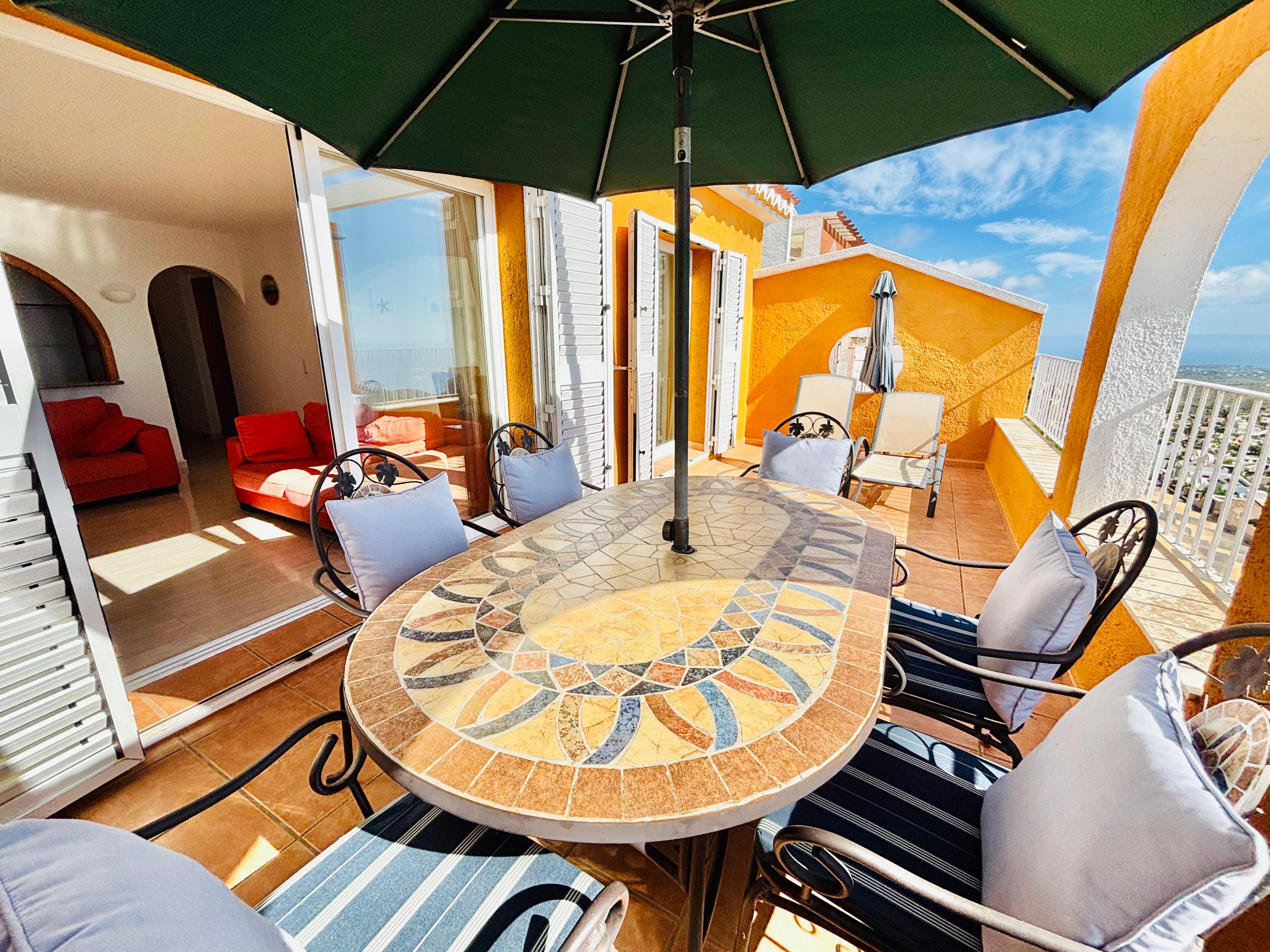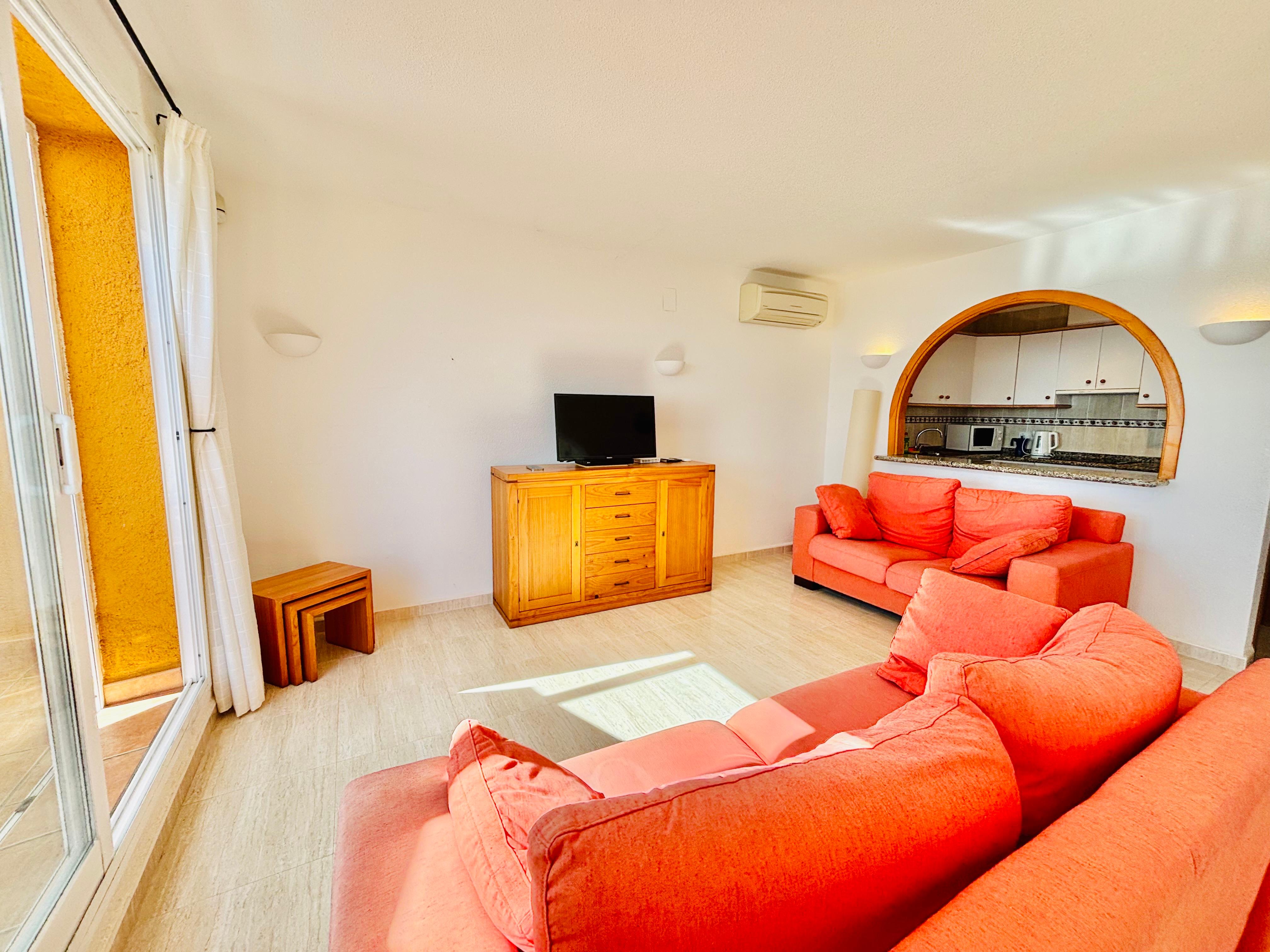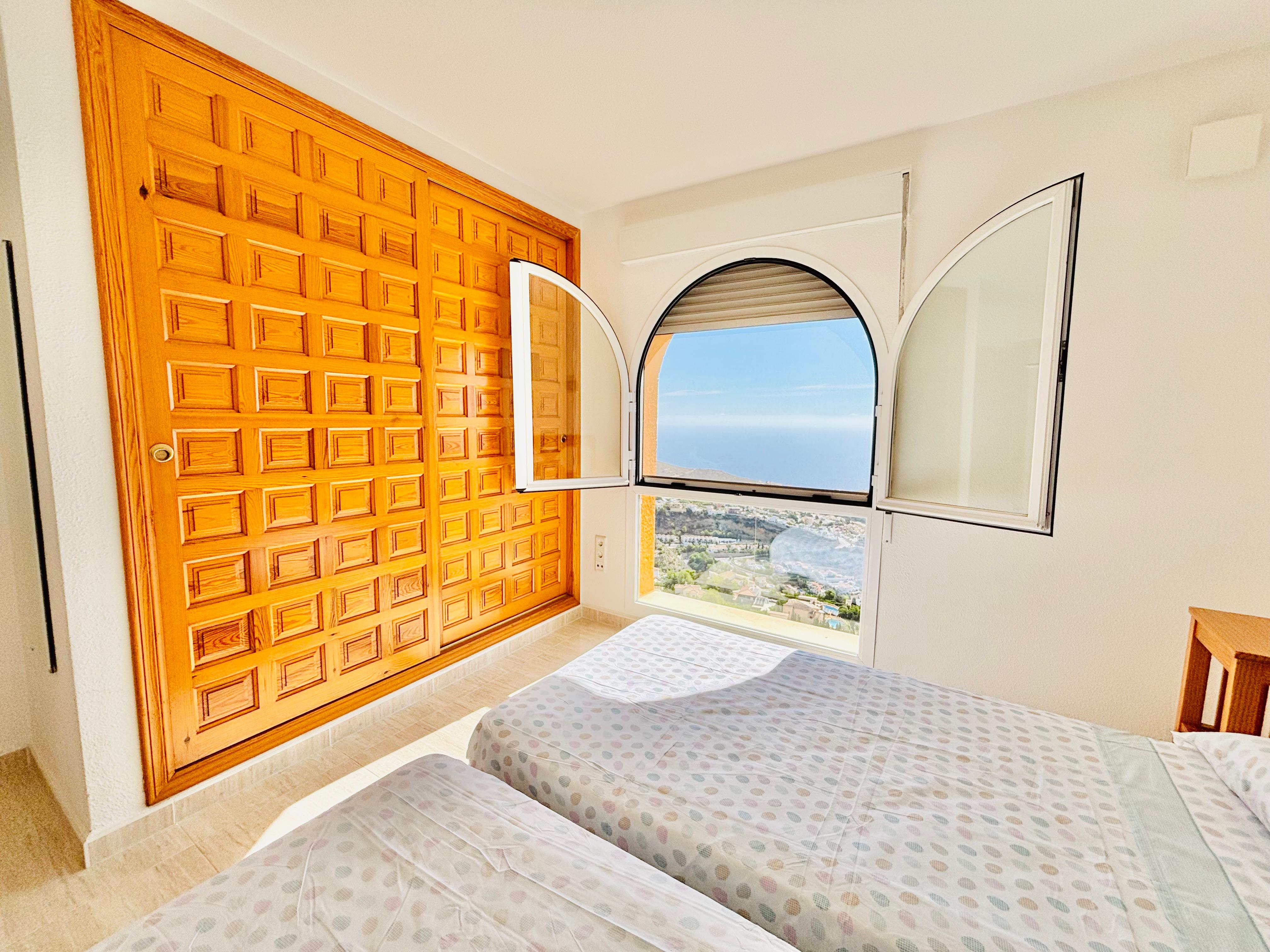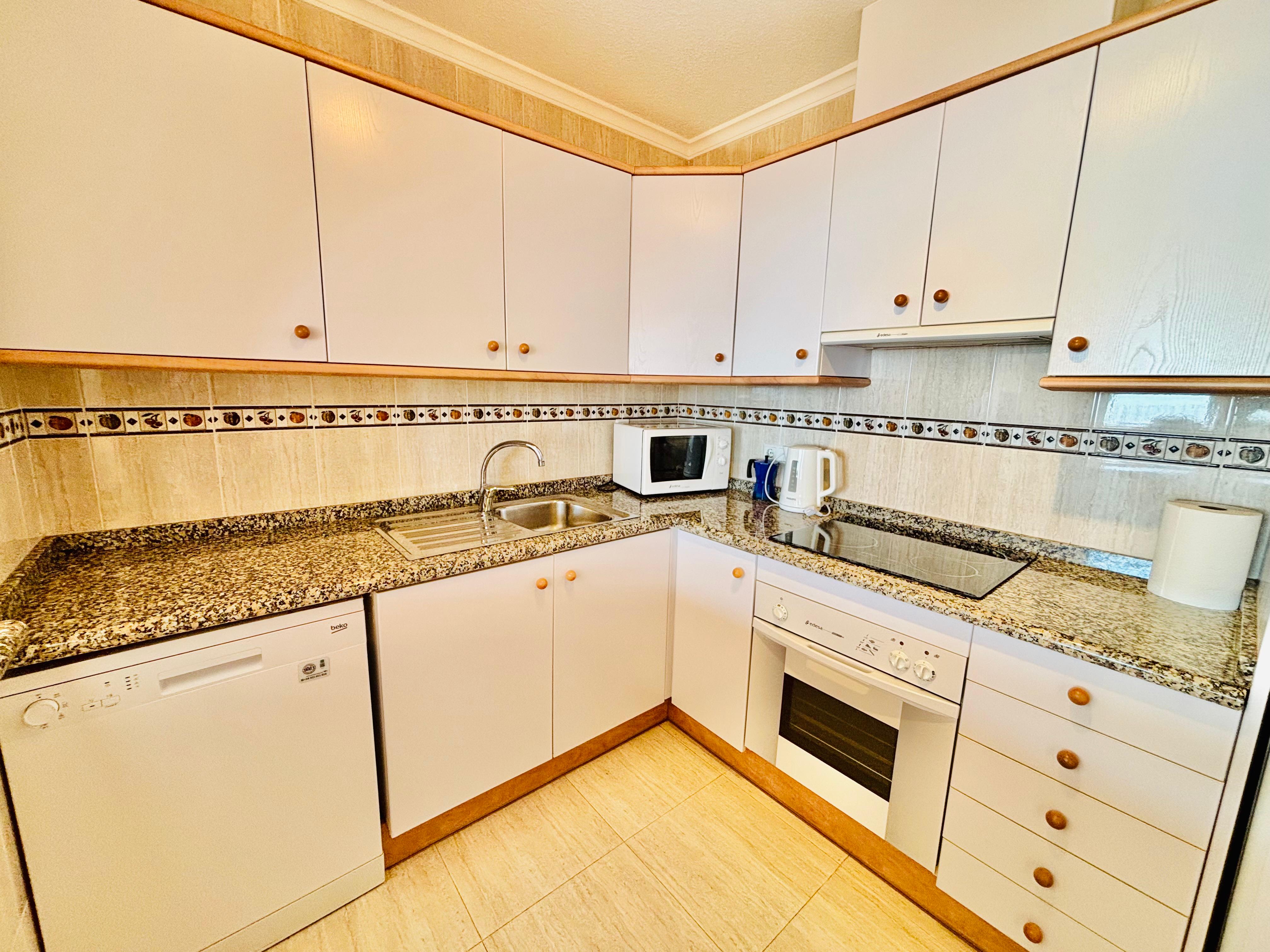 Available from September until the end of May 2027. (FULL RENTAL PERIOD ONLY). Top floor apartment with stunning sea views. Immaculate throughout, lounge and dining area with direct access to an open terrace from where the views will take your breath away, fully equipped kitchen with breakfast bar area onto the living area, there are 3 bedrooms with built in wardrobes and 2 bathrooms, (1 ensuite with bathtub and the family bathroom with shower), air conditioning hot and cold, wifi, located in Benitachell the Cumbre Del Sol area with private parking. Within a well maintained complex with communal swimming pool.