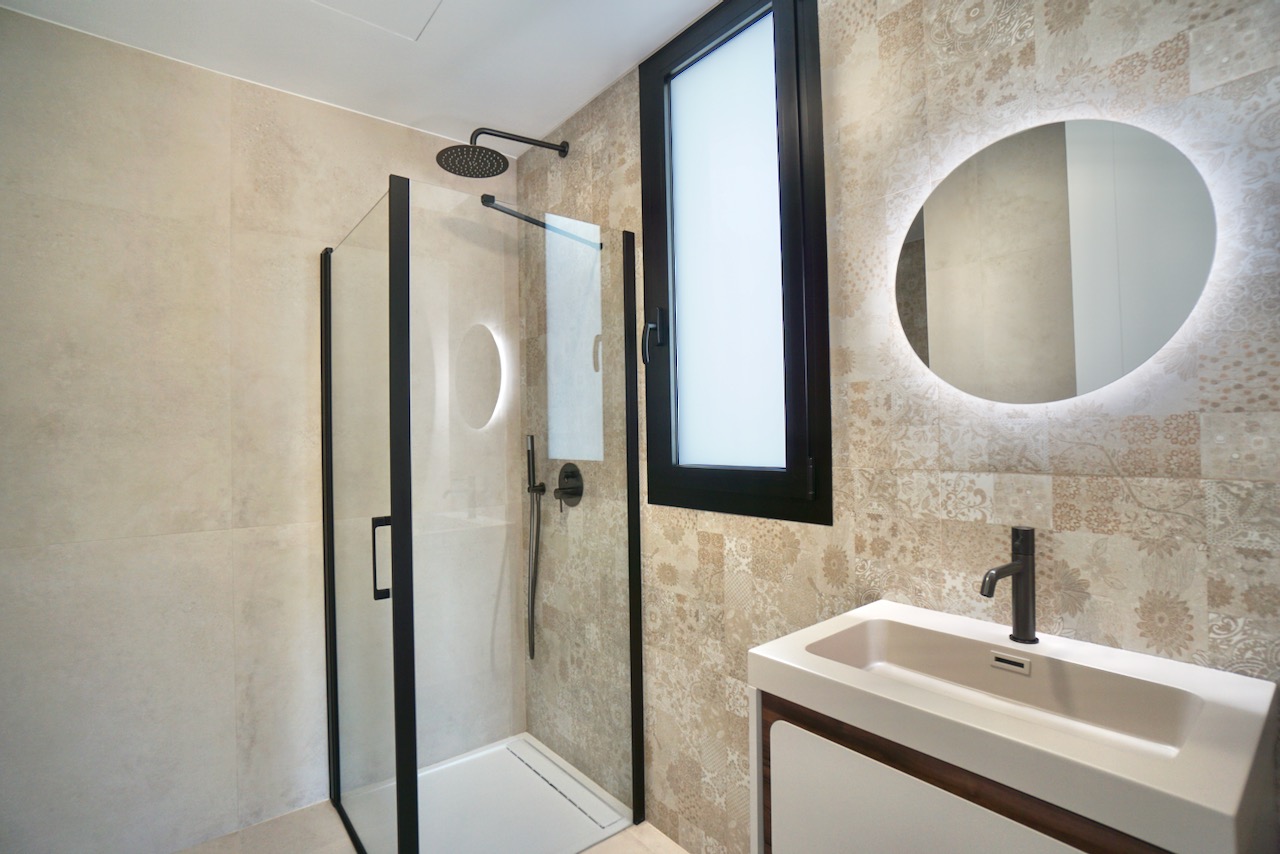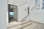 The staircase with glass railing leads us to the first bedroom. Spacious and bright with fitted wardrobe and ensuite shower room! The same fantastic tiled floor is throughout the house and the window and door finishing is the same everywhere. This offers unity and tranquillity! The views from this bedroom are also very nice. A few stairs up we find 2 more bedrooms, also with ensuite bathrooms. The master bedroom has a walk-in closet and an extra large bathroom with double washbasin, separate bathtub and shower! The rooms on this floor share a balcony with views towards the sea.