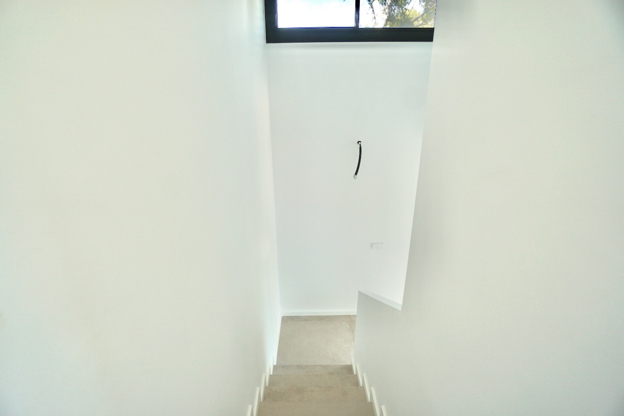 Last but not least, the house stands on a plot of 508m2, the garden can be laid out to your own taste. The private pool is infinity and there is a solar shower to rinse off after a great swim! There is centralised air conditioning throughout the whole house. One can set a temperature per zone. There are also 12 solar panels generating 5kw, located on the flat roof of the villa. And also pre installation for a heat pump for underfloor heating throughout the property and a ventilation system. The windows have black profiles and enjoy electric shutters. There is possibility to connect to fibre optic internet.