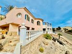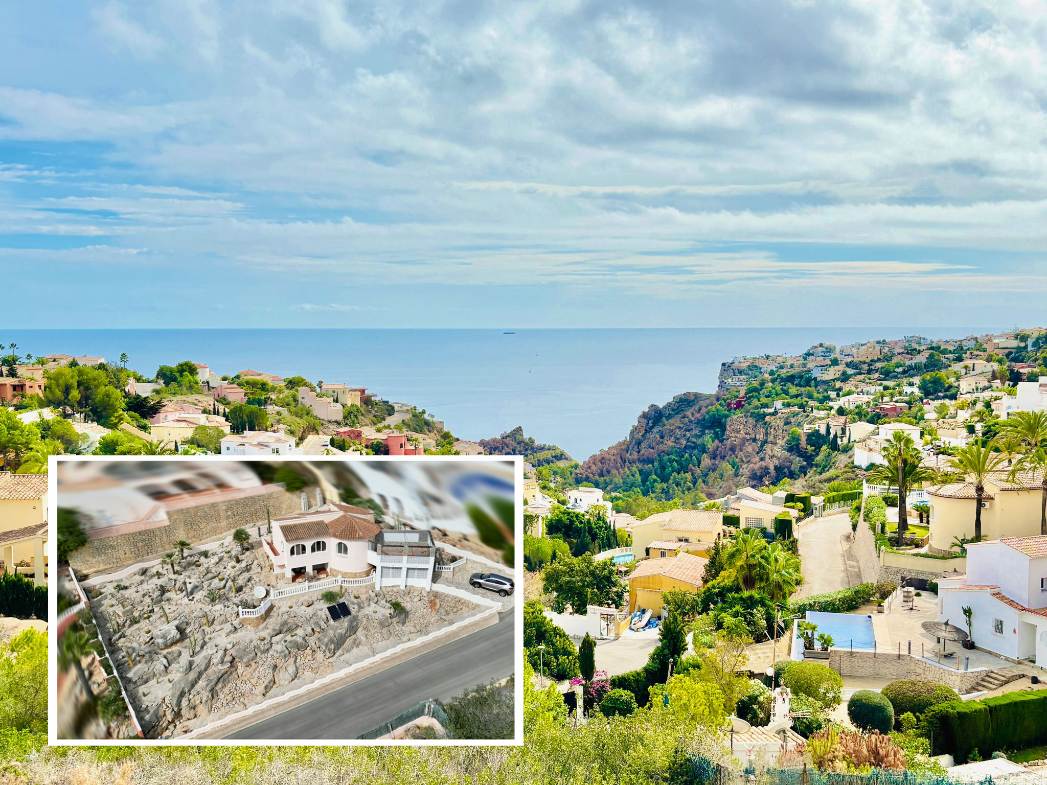 Villa with great sea view for sale in Benitachell Cumbre del sol, south facing, quiet location, possible to build a swimming pool, compact villa in excellent condition, main level has entrance with reception room, lounge/dining room leading to large outside terrace with great south facing sea view, 2 bedrooms, 1 bathroom, kitchen, lower level has private parking area, store room, the plot is very low maintenance.