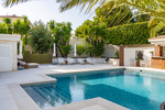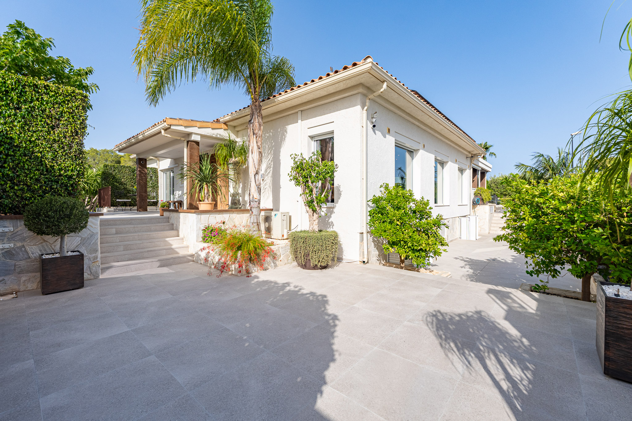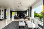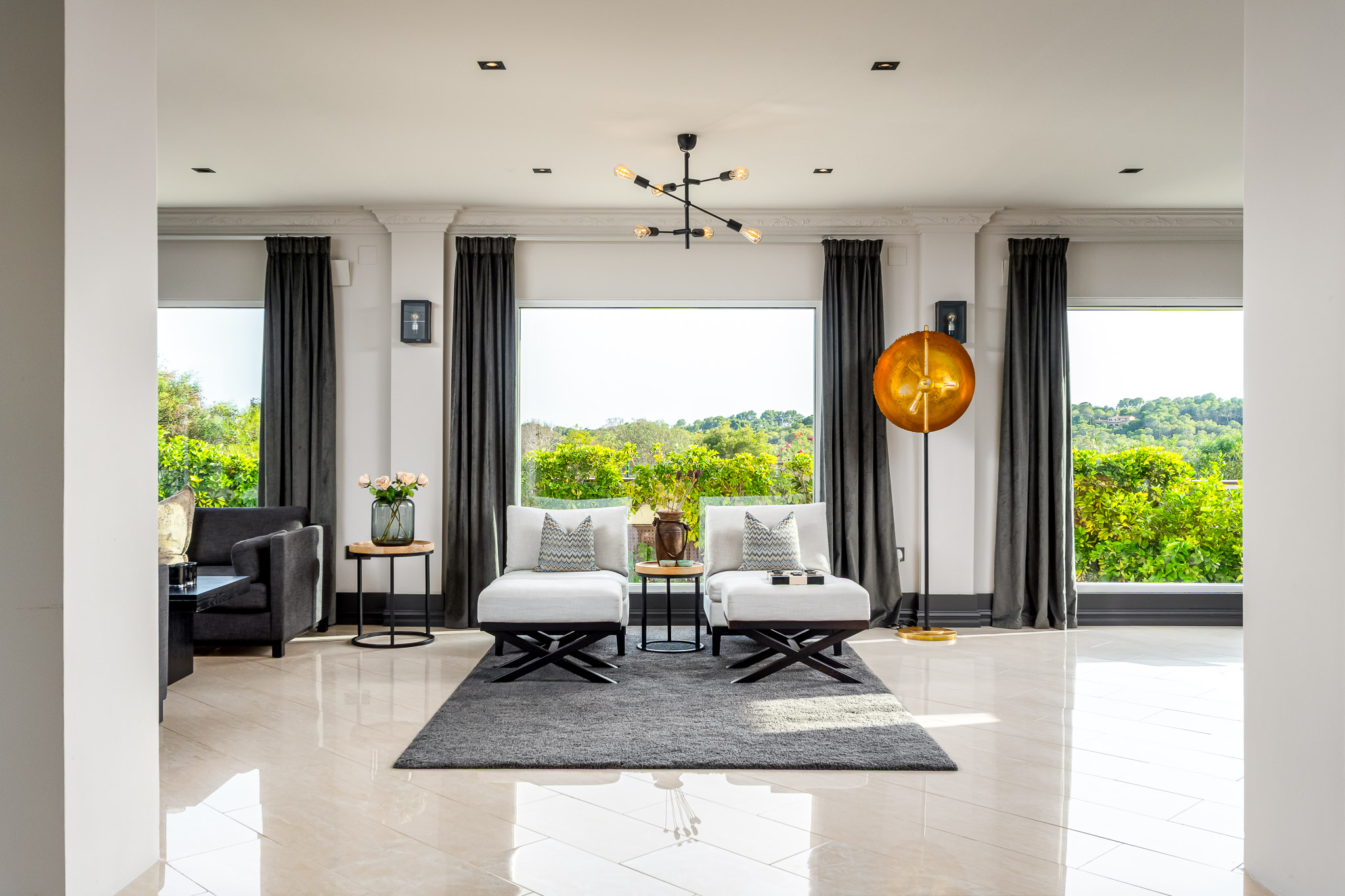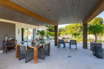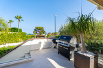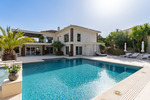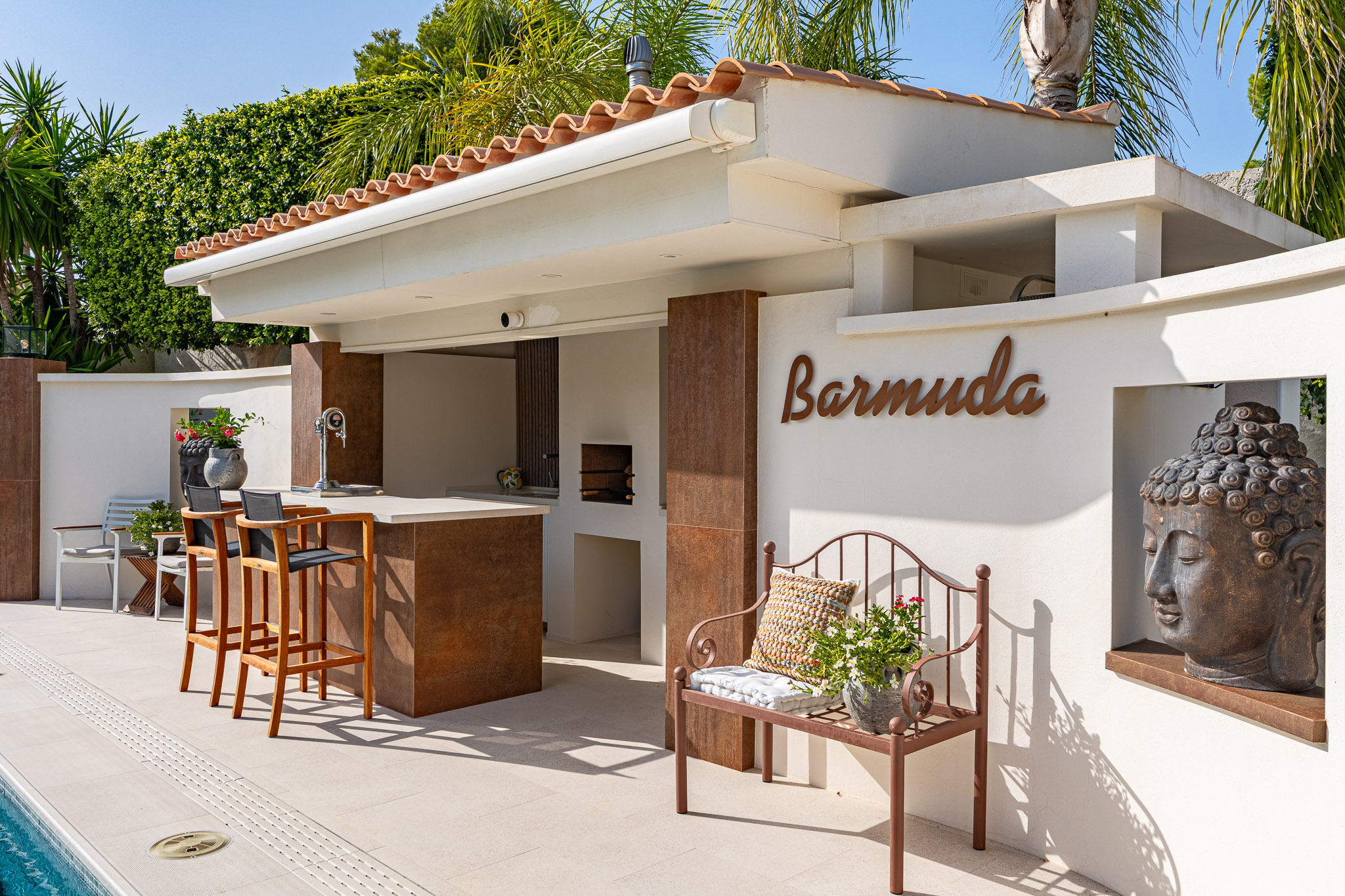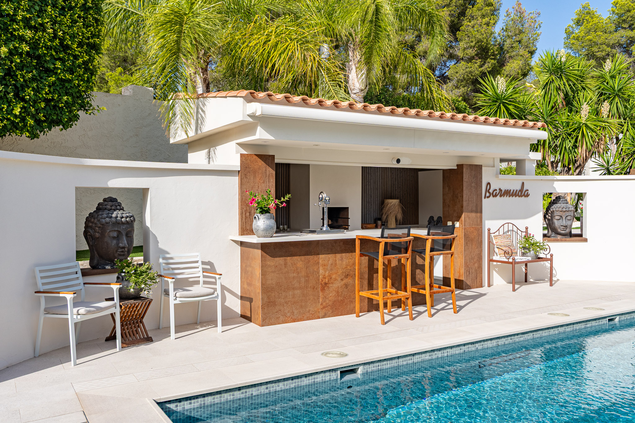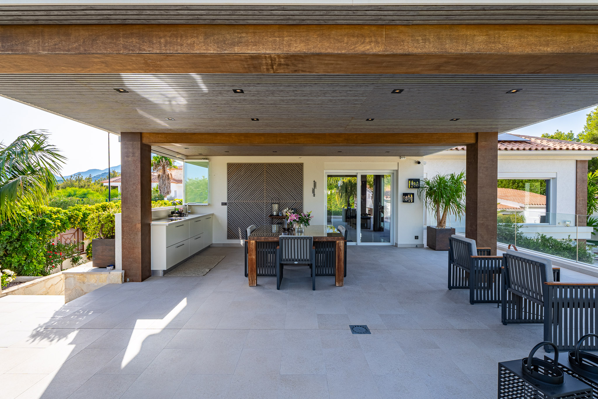 Outdoors, the villa is designed for year-round enjoyment, with multiple terraces, a luxury outdoor kitchen with beer tap, dining and lounge areas, and a heated saltwater pool with automatic cover. The mature garden has automatic irrigation, and the property is equipped with 21 solar panels, battery storage, and advanced insulation for energy efficiency.