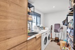 The main living area is conveniently laid out on one floor, featuring an open-plan living room with a modern fireplace, a fully equipped kitchen, and two bright bedrooms sharing a stylish bathroom. A utility room provides extra storage space for convenience.