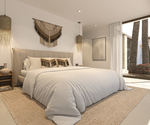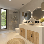 The villa’s sophisticated interior boasts high-quality finishes, featuring microcement in the bathrooms and throughout the flooring, alongside oxidized double-glazed aluminum windows. Each bedroom is fitted with exterior electric shutters, while the bathrooms showcase modern black fixtures for a chic, contemporary touch.