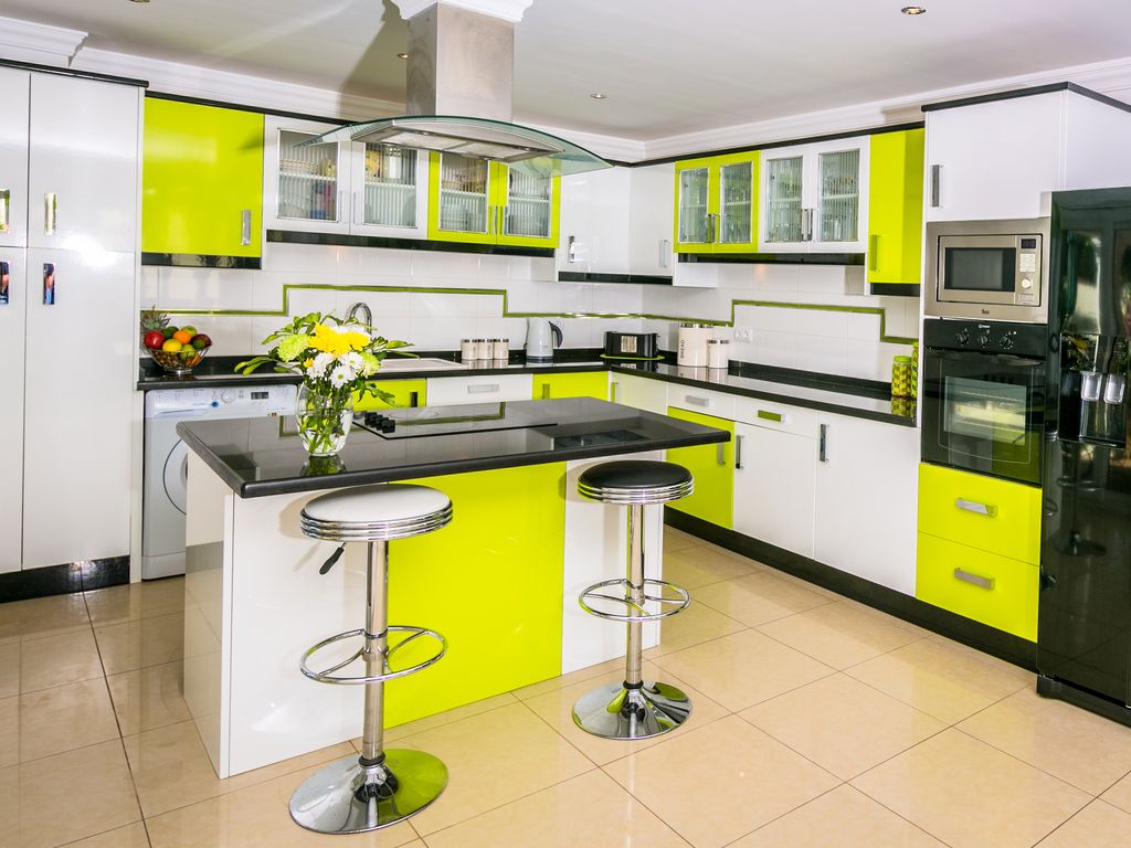 A generous entrance hall opens into a bright, open-concept living space featuring a fully equipped American-style kitchen and a welcoming dining area. Large doors provide direct access to the pool terrace and garden, making this zone perfect for hosting gatherings or enjoying relaxed sunny afternoons. A well-appointed utility room sits alongside the dining space, offering additional access to an outdoor side terrace.