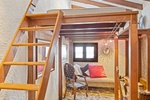 The master bedroom is located on the upper floor and offers direct access to a large, enclosed terrace that is also ideal as an office or studio.