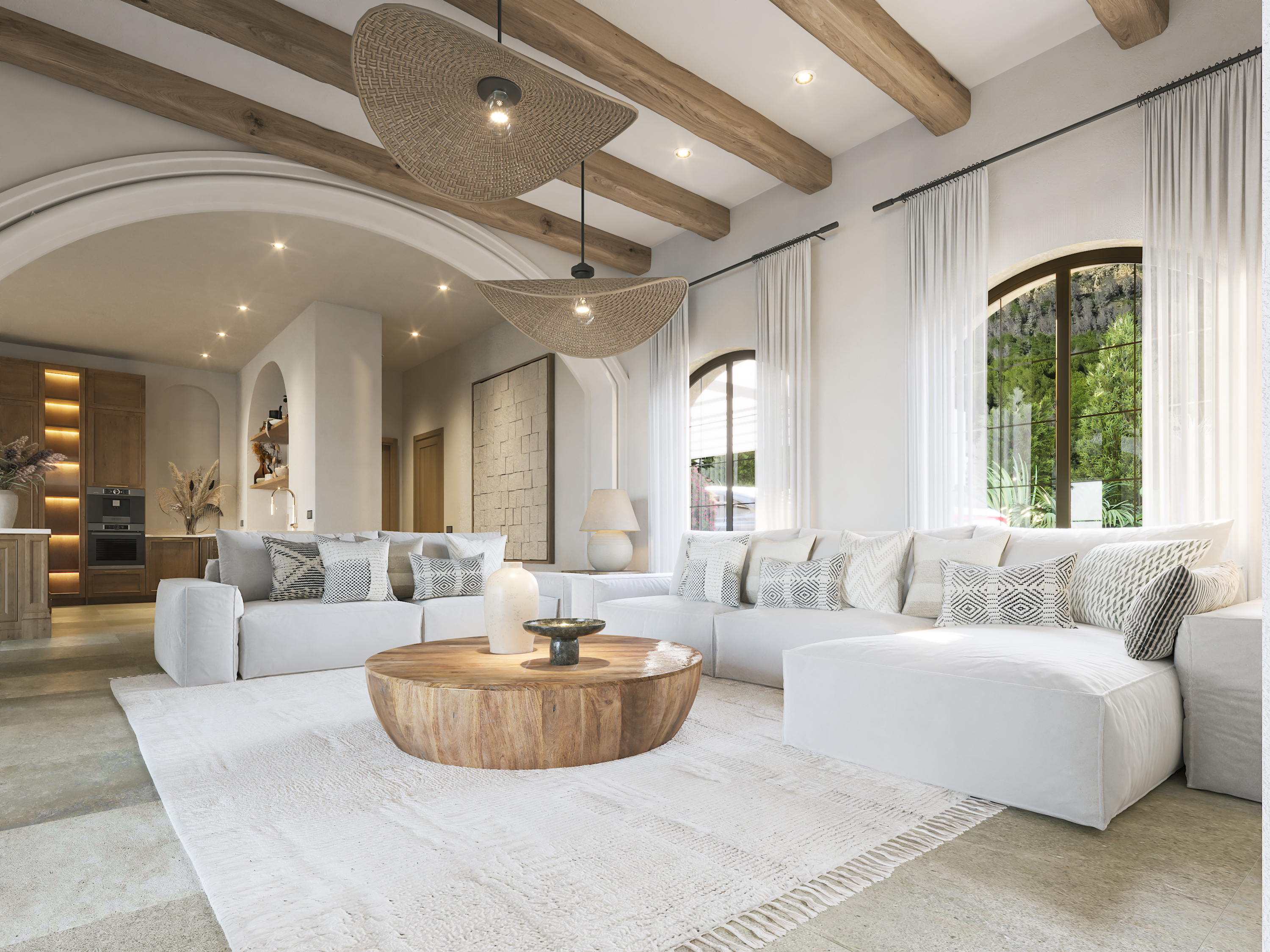With a harmonious silhouette and warm tones bathed in Mediterranean light, Villa Azahar reinterprets the timeless charm of American colonial residences, merging it with modern Mediterranean elegance. Its imposing volumes, traditional tile roofs, pillars and exposed wooden beams make up an architectural work of art where luxury and serenity coexist in perfect proportion.