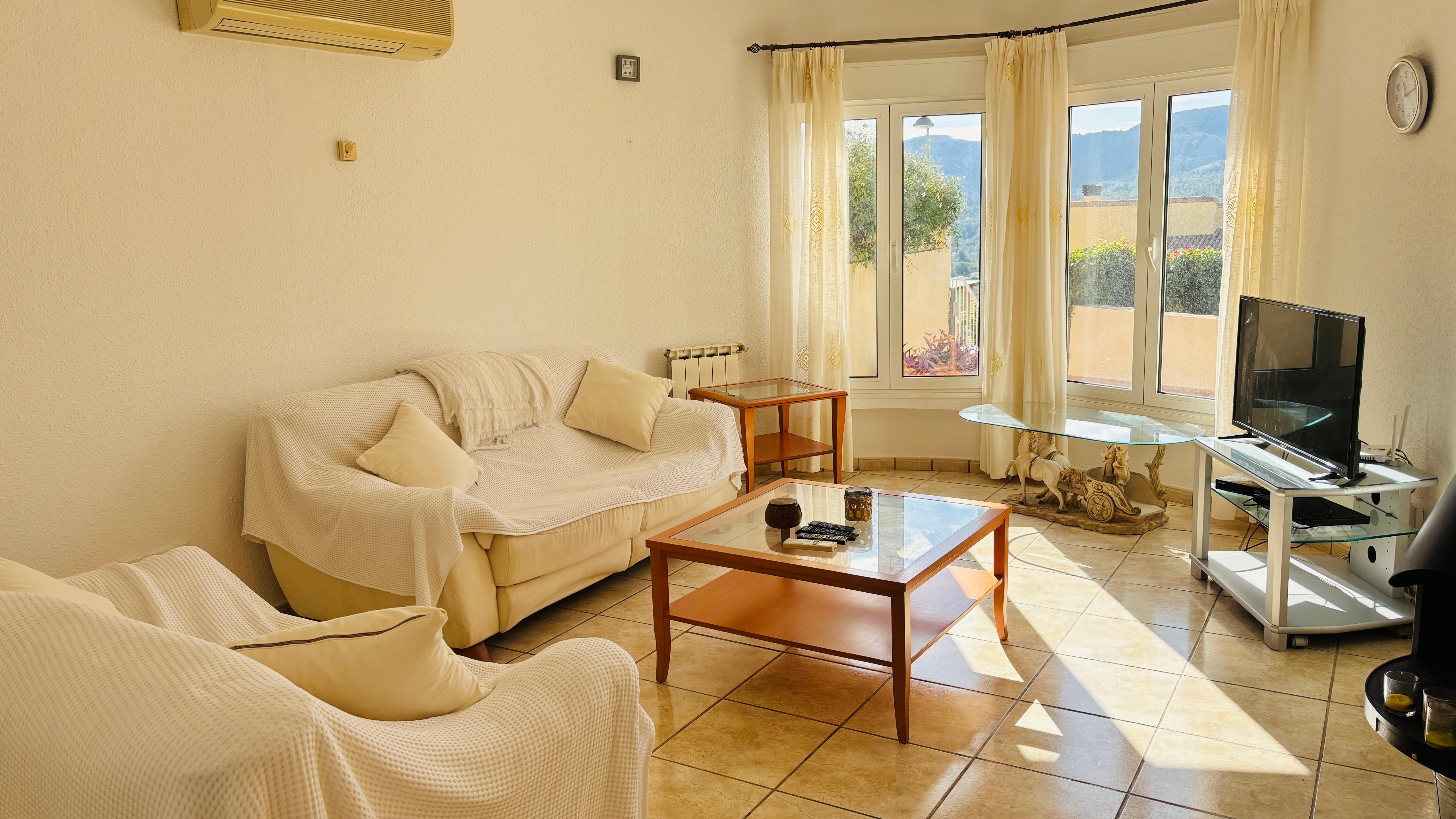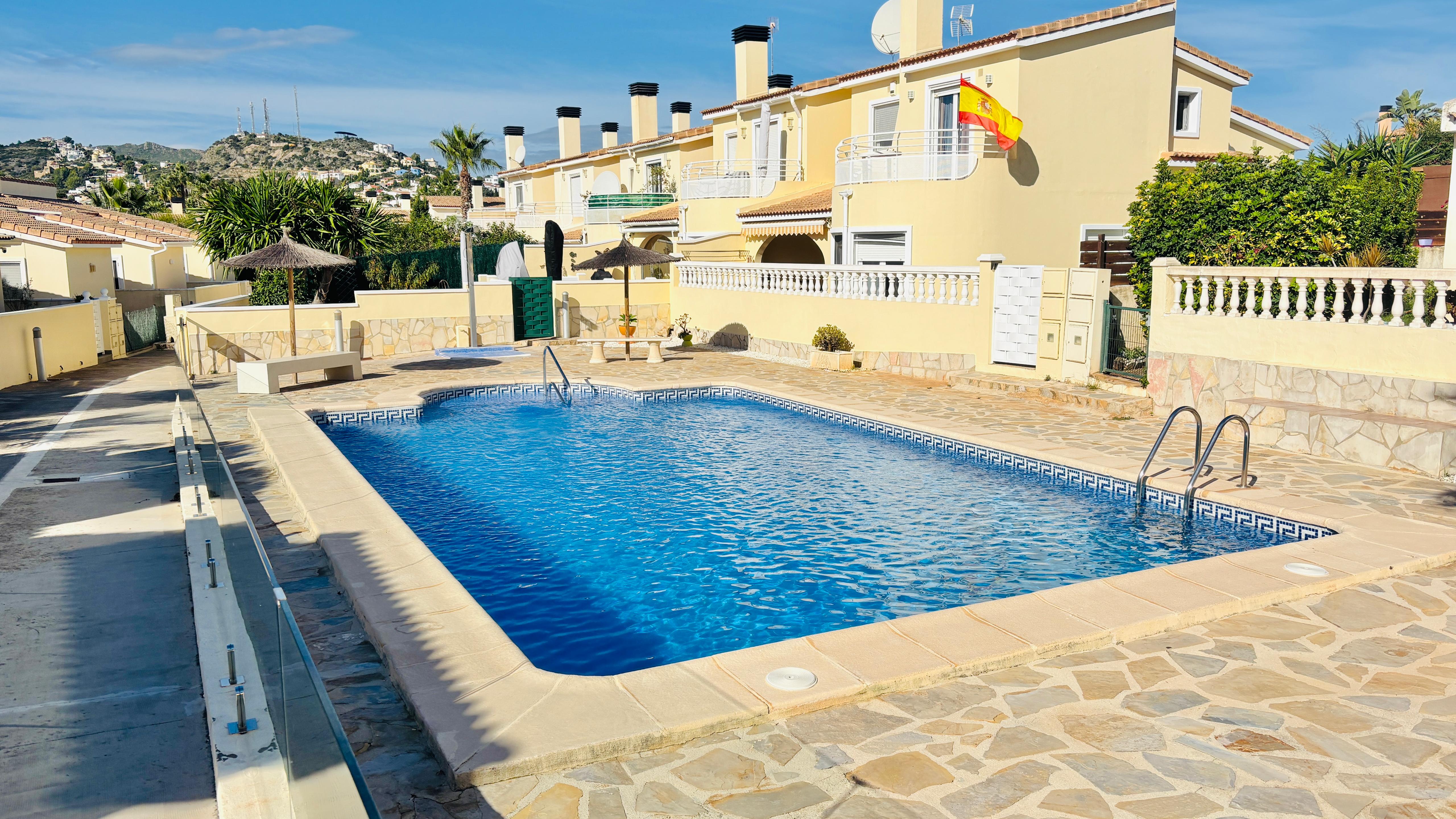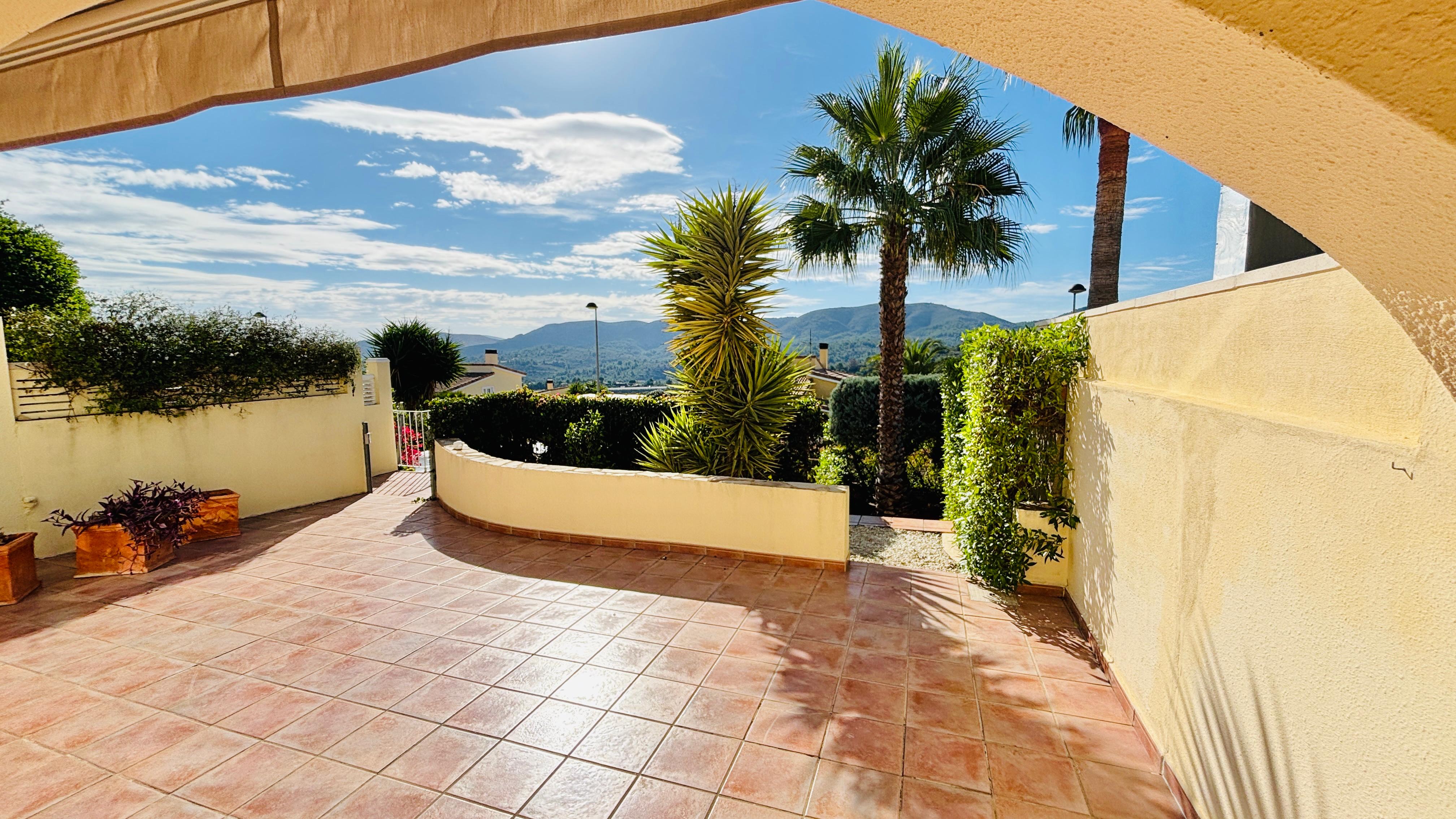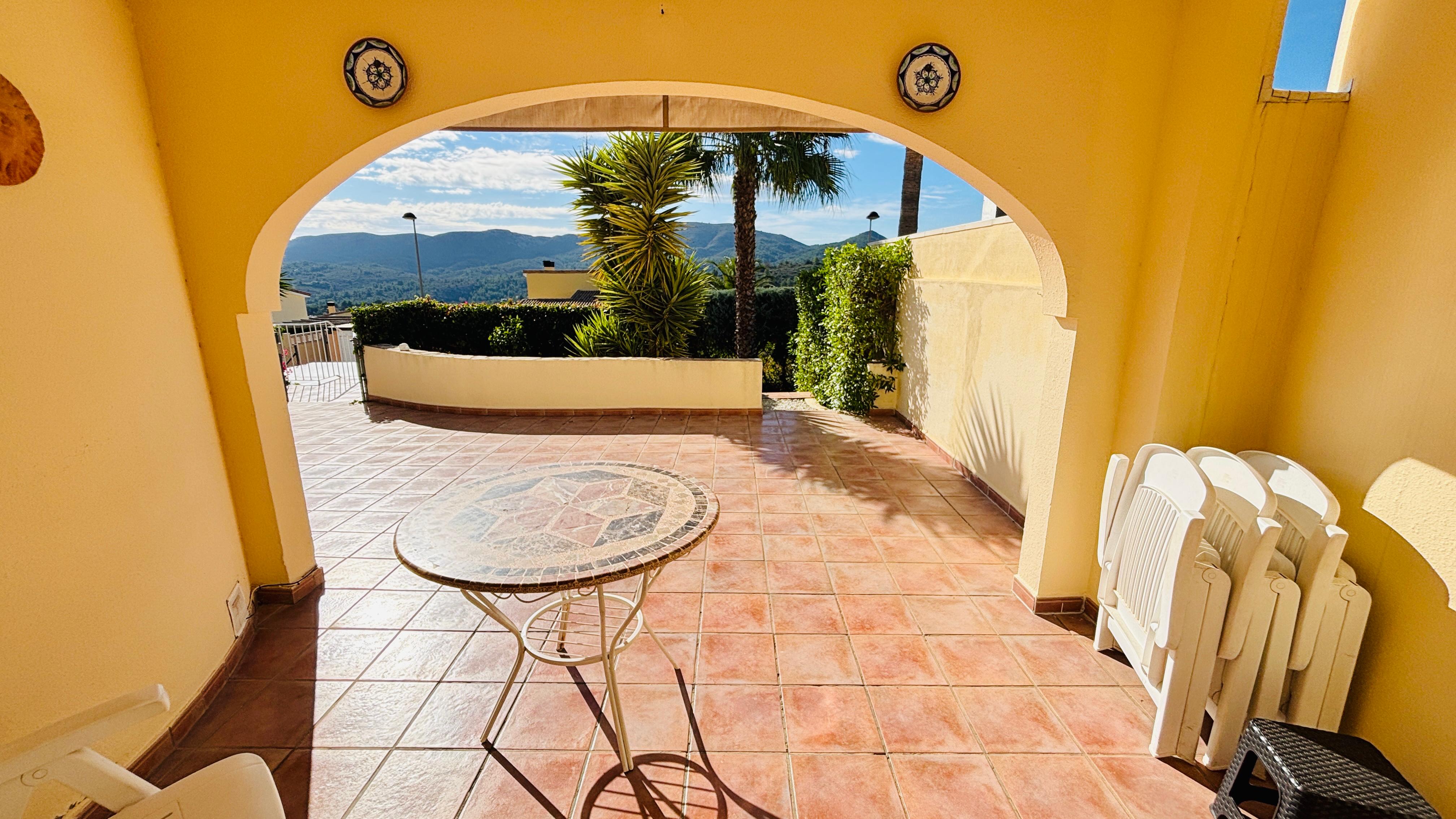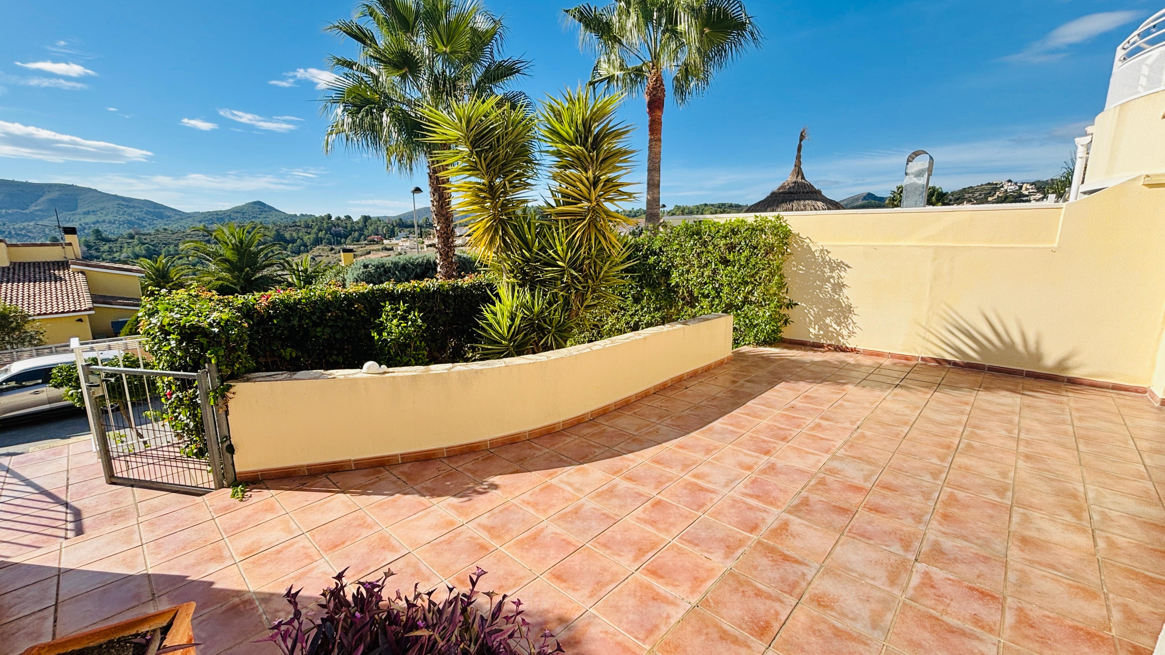 Private villa for sale in Residential Gata, community pool, south facing, in immaculate condition, the villa has 3 bedrooms, and 2 bathrooms, the master bedroom has double wardrobes, ensuite bathroom and a south facing terrace with great views, main level has spacious lounge/dining room, kitchen with pantry and external utility room, outside there is a covered and open spacious terrace with small garden with steps leading down to the private parking space, the communal pool is accessed via the rear of the property and is only 20 meters away, the property is located in a quiet residential area and has great views from the property.