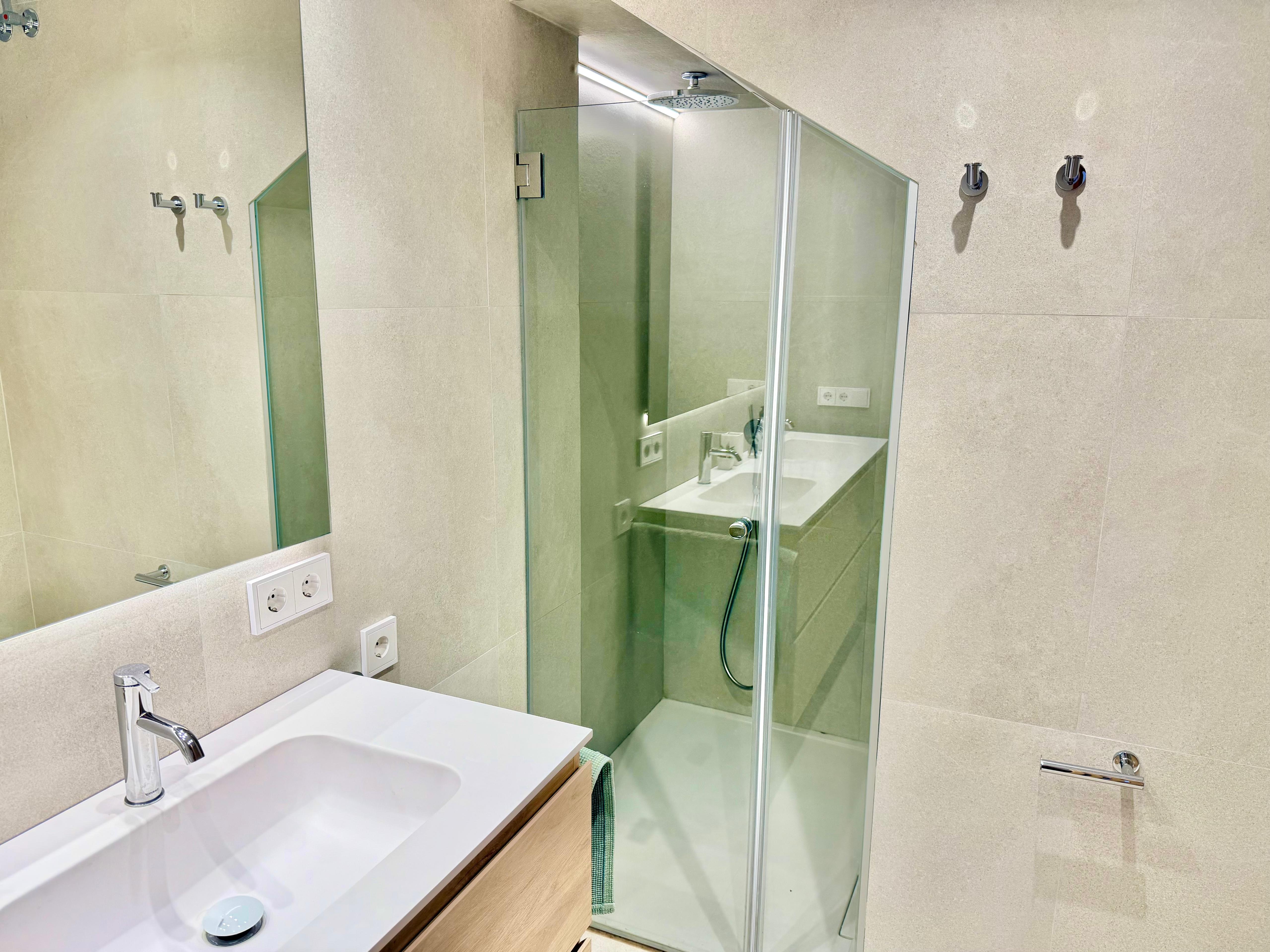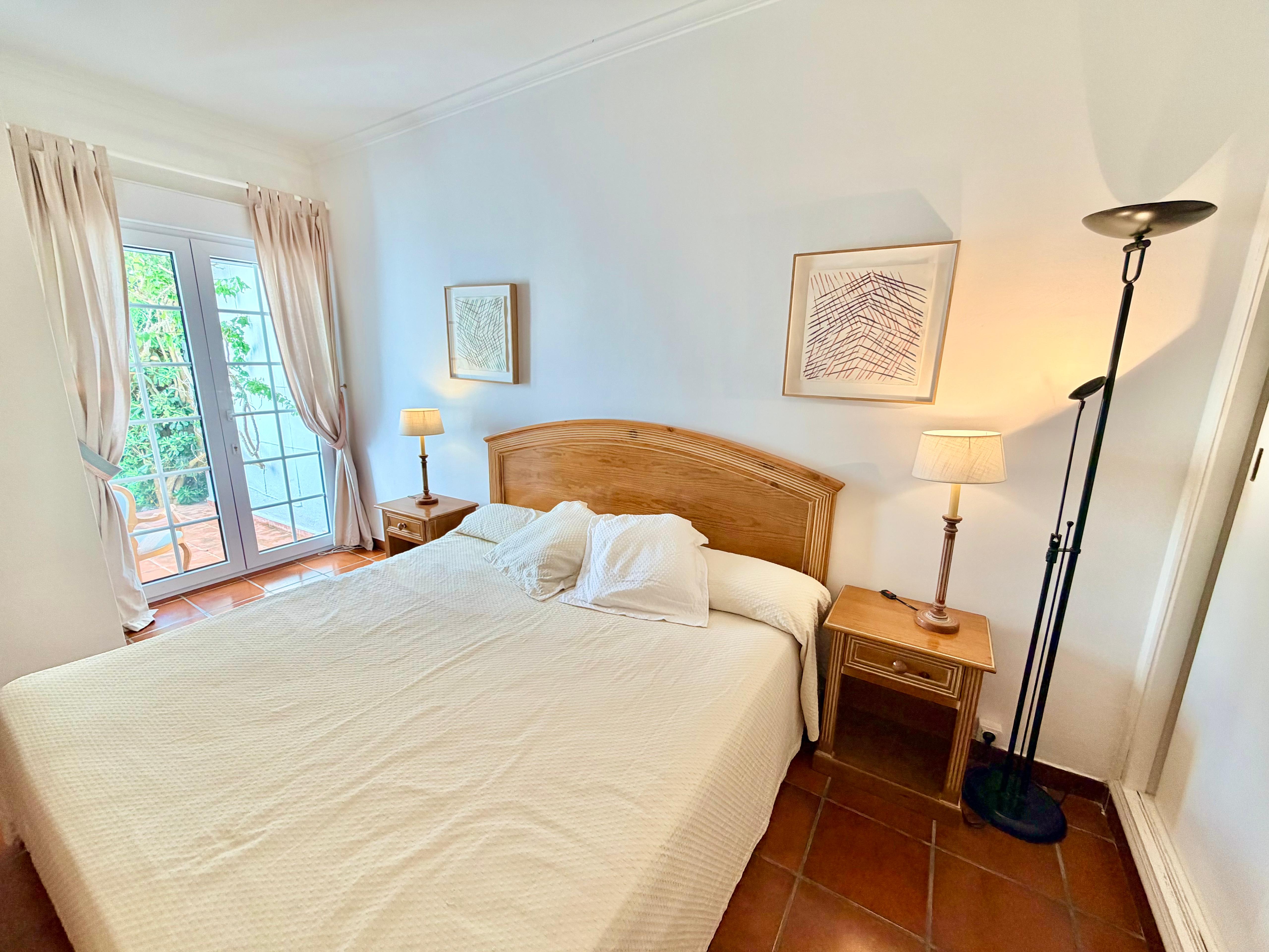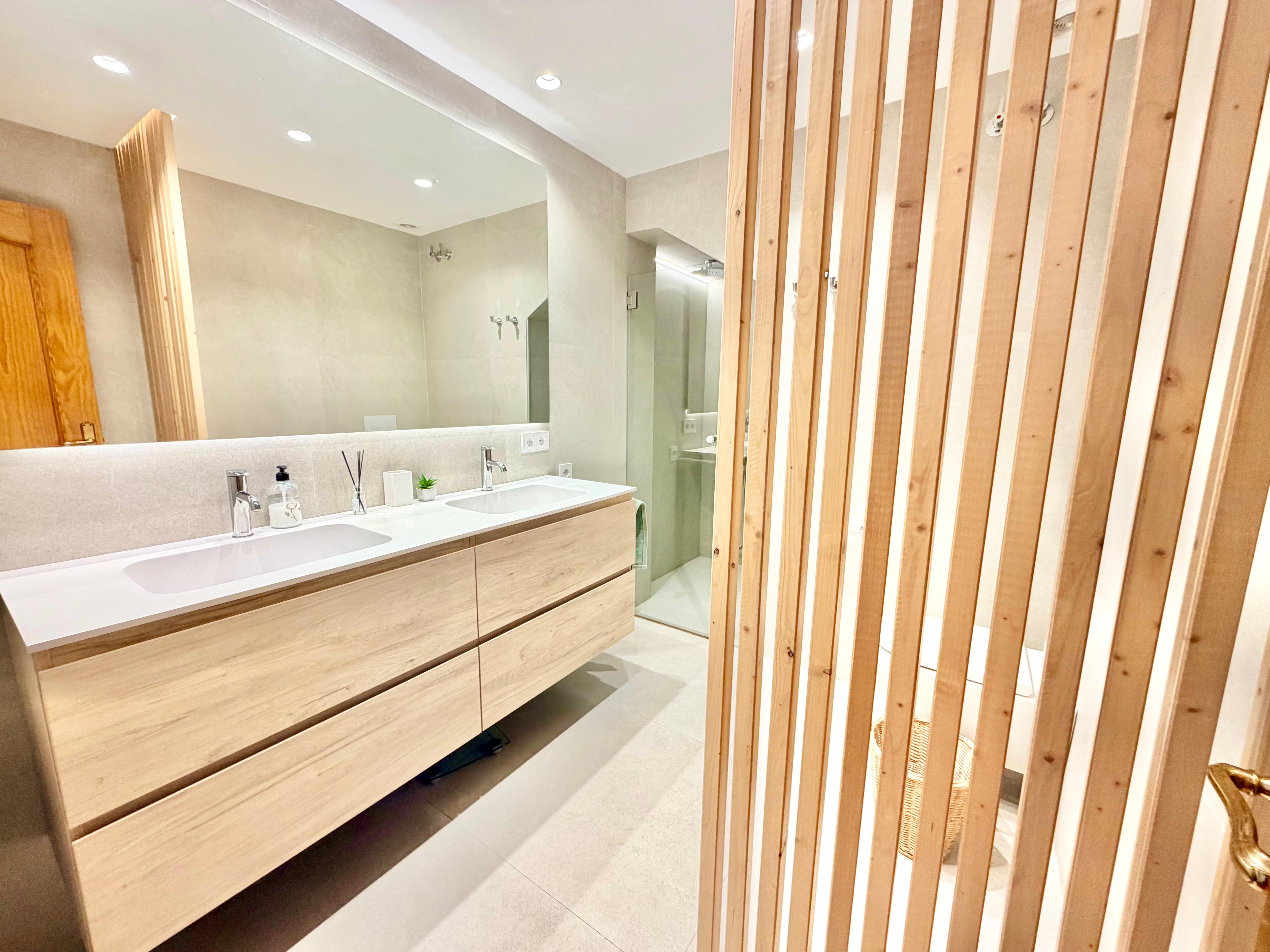 The lower level, accessible via both internal and external entrances, comprises 3 bedrooms. The master bedroom offers a double bed, large fitted wardrobes, a modern en-suite with walk-in shower and double sink, and direct access to a private garden area. Two additional twin bedrooms share a stylish second bathroom with a walk-in shower.