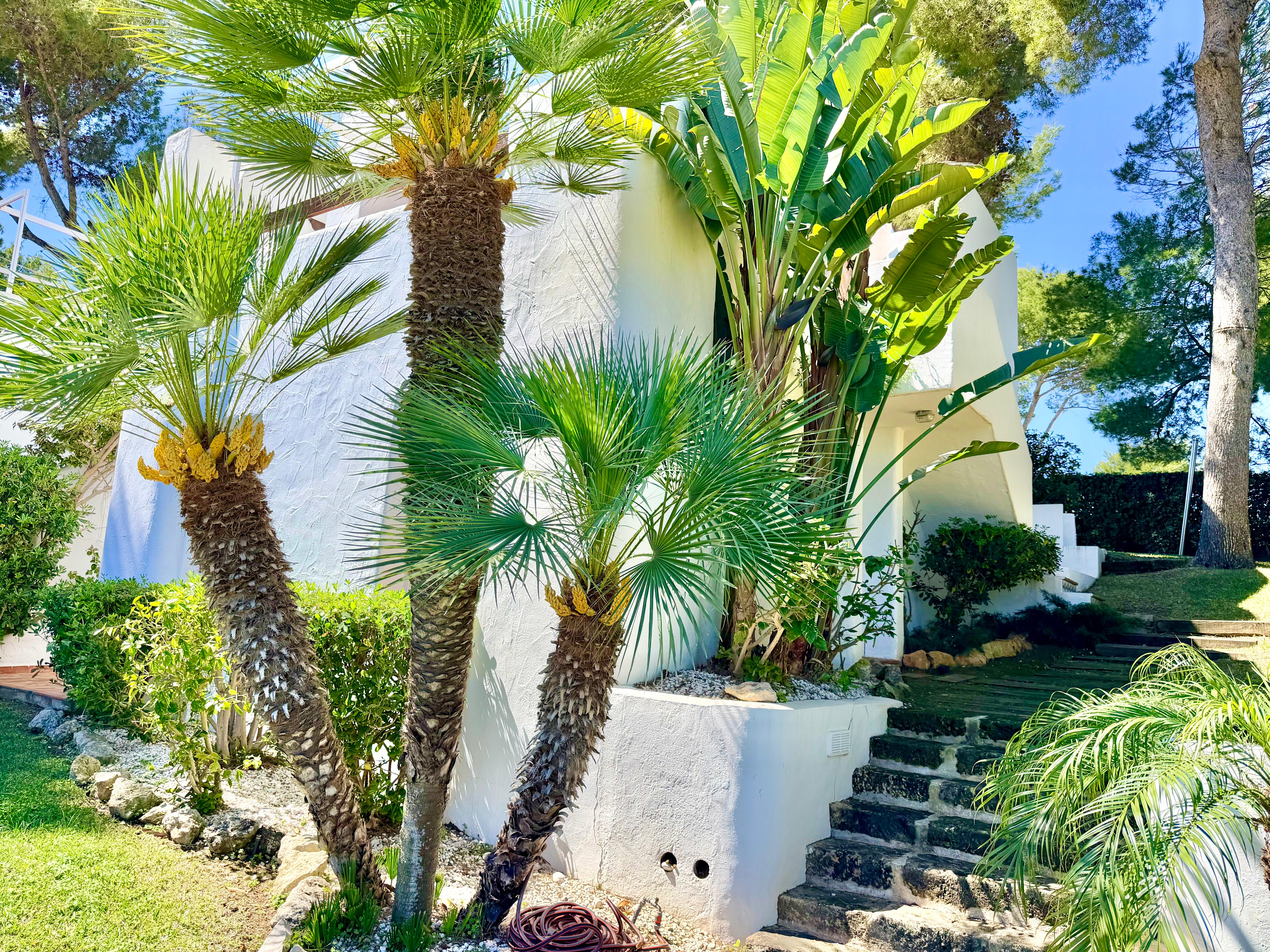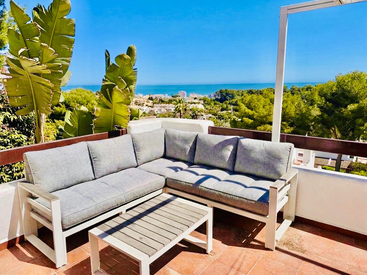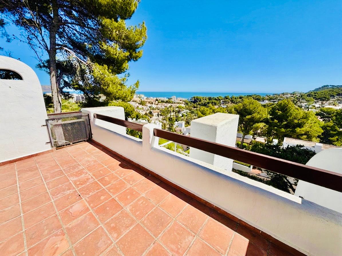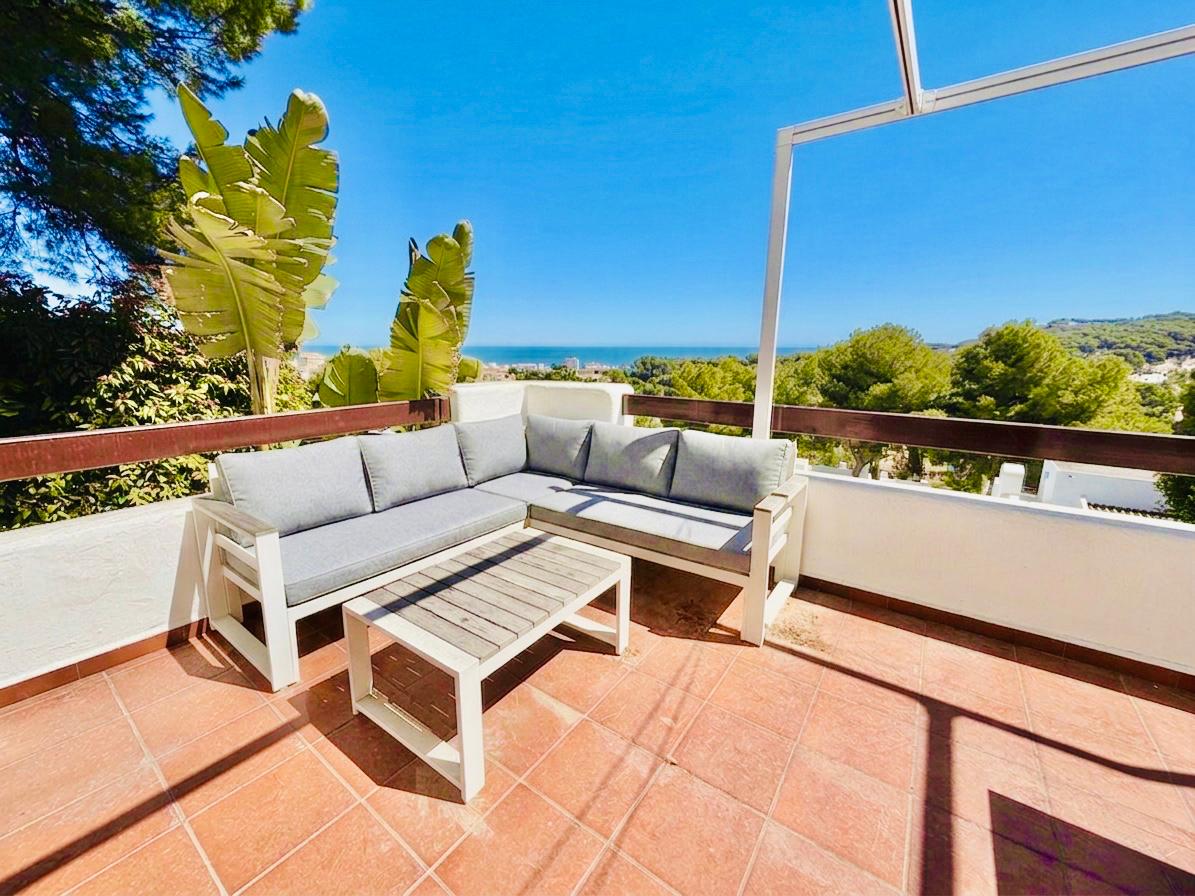 This beautiful Ibiza-style small villa with 3 bedrooms and 2 bathrooms has three levels and offers bright, spacious living with stunning sea views. Located close to the Arenal beach and all amenities.